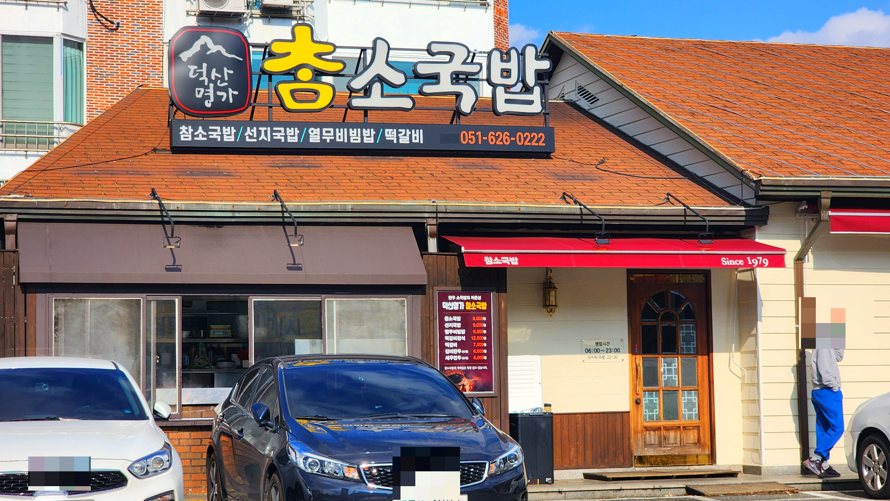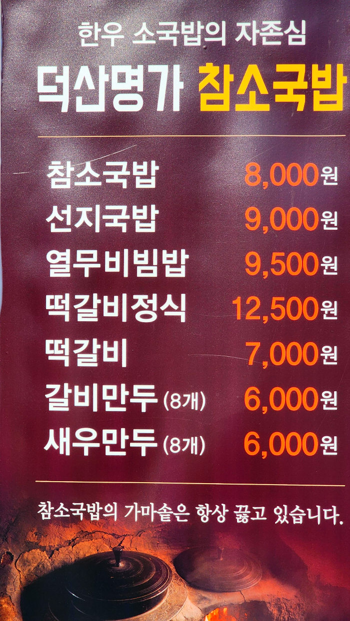 덕산명가참소국밥은 부산광역시 남구 대연동에 있는 한우국밥 전문점이다. 이곳이 본점이고 동래에 분점이 있다. 대표메뉴는 참소국밥과 선지국밥으로 24시간 가마솥에 육수를 끓여 진한 맛이 일품이다. 국과 함께 제공되는 밥은 갓 지은 무쇠솥 밥으로 밥맛이 좋다. 떡갈비와 떡갈비 정식도 있고 열무 비빔밥도 있다. 원하는 식탁에 자리를 잡은 뒤 주문은 직접 키오스크를 이용해야 한다. 새벽 일찍 문을 열어 해장국을 겸한 아침 식사를 할 수 있고 밑반찬이 정갈하고 맛이 좋다. 식당 바로 앞 UN 조각공원과 수목 전시원 등이 있어 식사 전후 둘러보기 좋다.