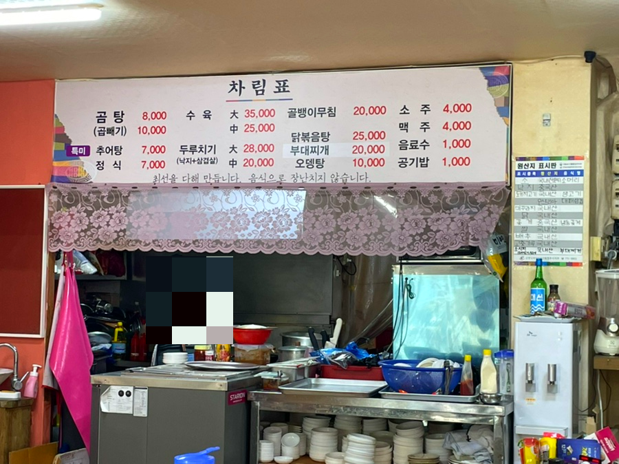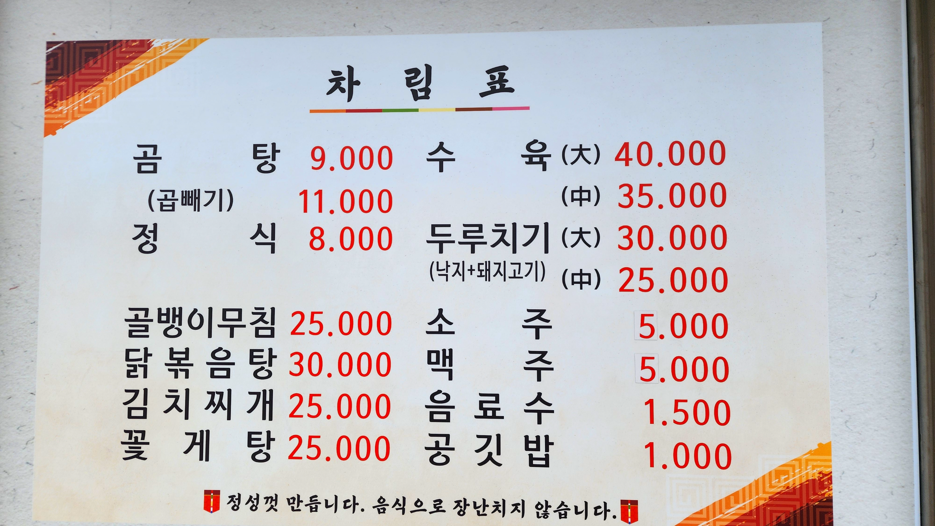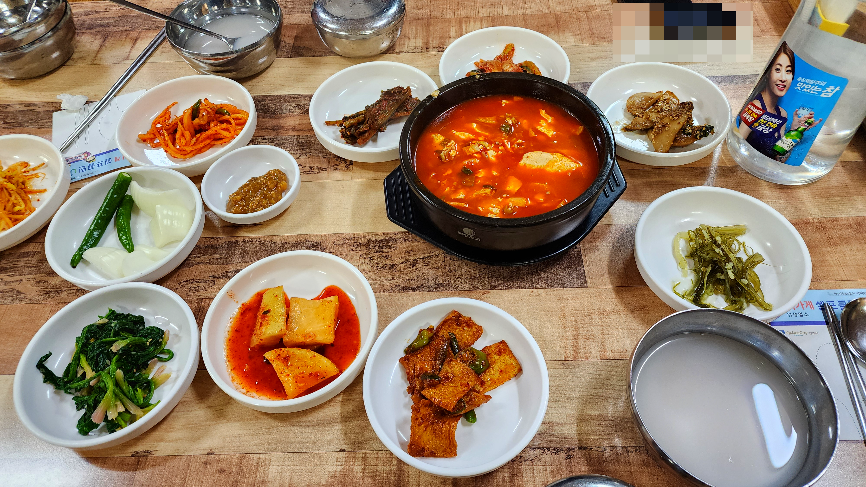 1. 일행중 1명은 '곰탕'을 주문했고, 일행 2명은 일성가마솥 메뉴 중에서 '백반정식'을 주문하면 나오는 상차림 기본찬으로는 시금치나물, 깍두기, 어묵조림, 미역줄거리볶음, 콩나물무침, 무생채, 무말랭이무침, 우엉조림, 시래기나물 등 9찬에 풋고추+양파+쌈장, 그리고 메인메뉴 순두부찌개의 구성으로 차려진다.