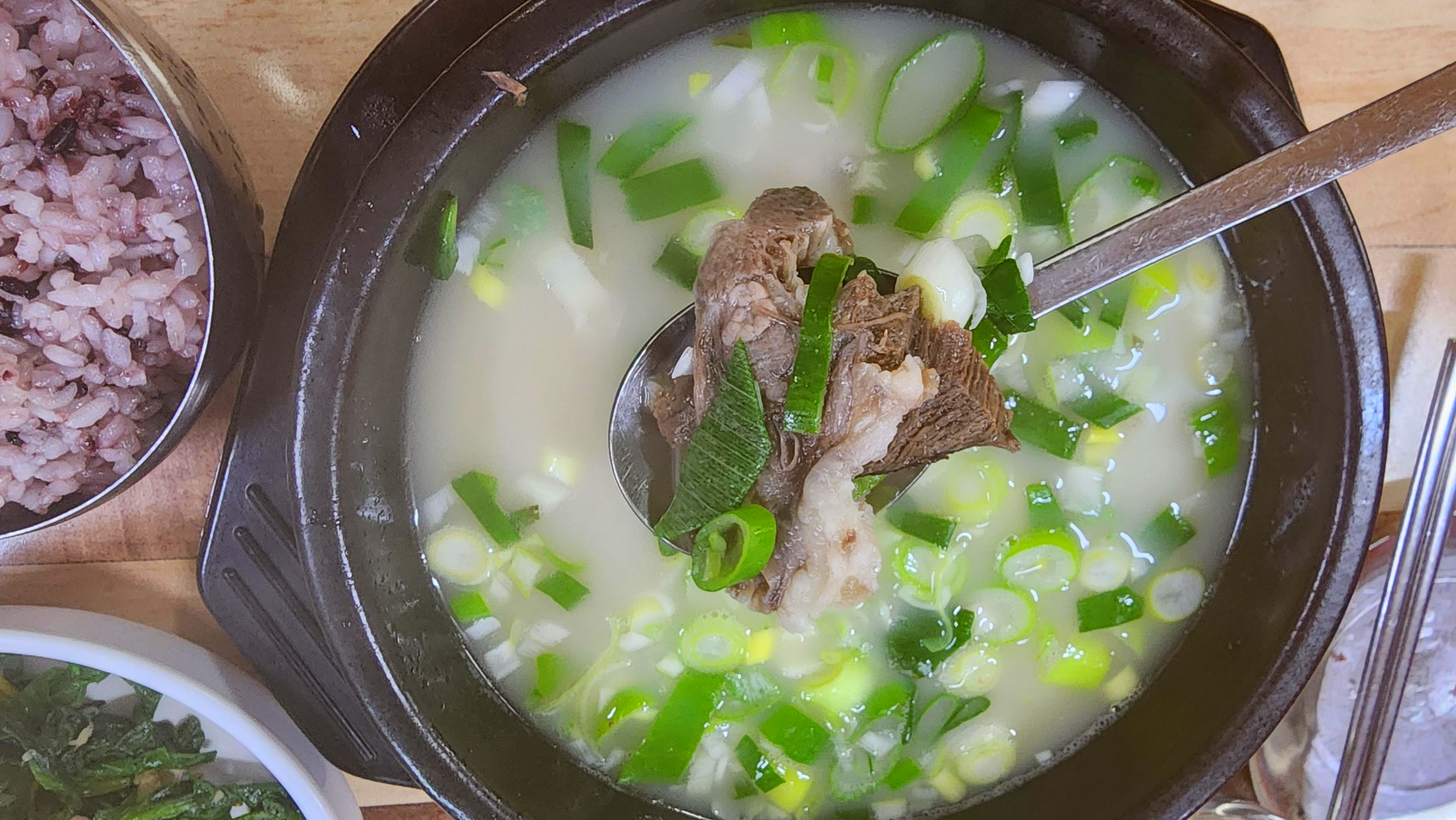 곰탕은 고기로만 국물을 우리기 때문에 국물색이 탁하지 않고 맑은 것이 특징이다. 맛을 보면 고기의 육향이 국물에 배어들어 심심하지만 찰나를 스치는 육향이 매력적이다. 곰탕은 찬바람 부는 겨울이나 과음 후 다음 날 해장으로 딱인 음식이다. 뜨끈한 국물이 지친 속을 달래준다. 곰탕에 한번 빠지면 헤어 나올 수 없는 이유가 바로 그것이다.