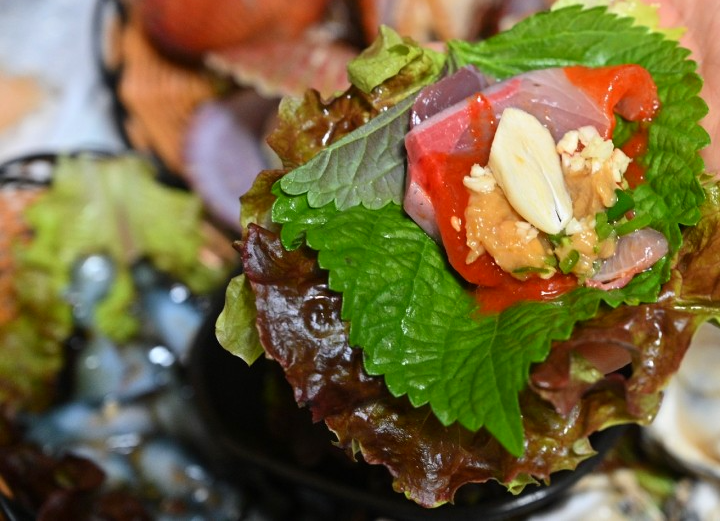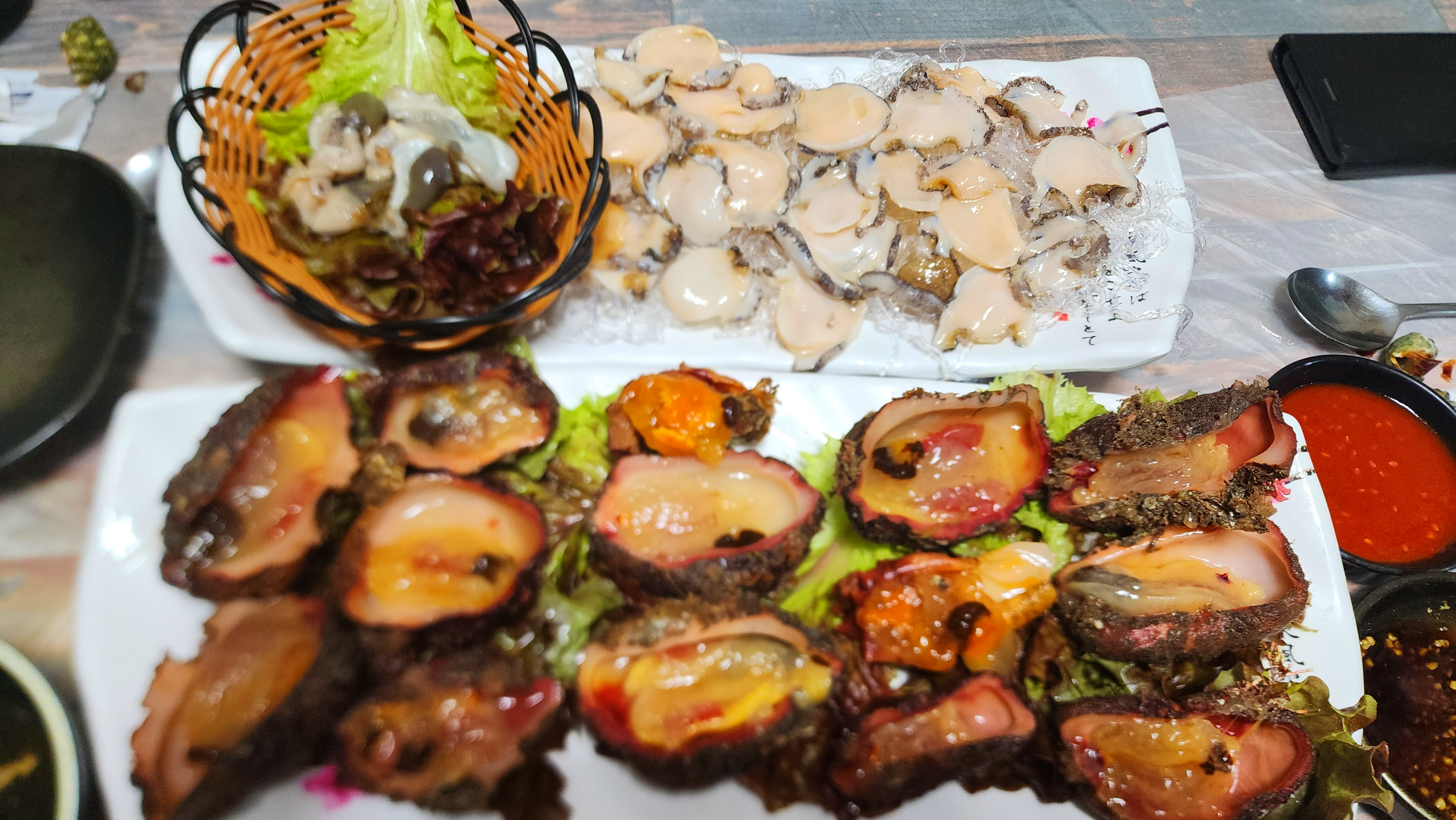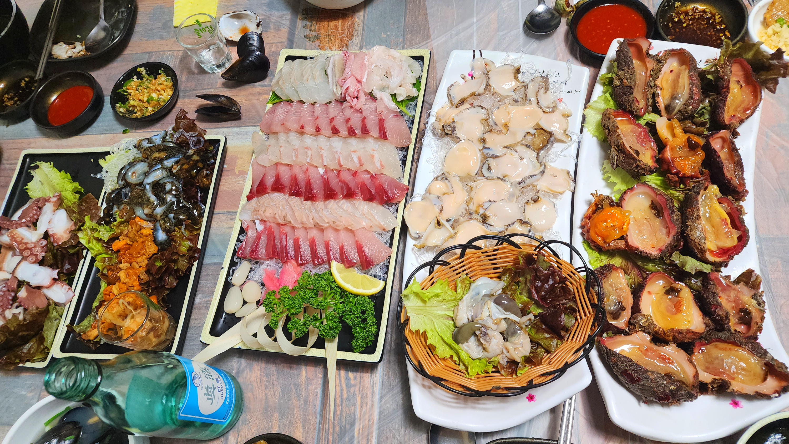 ▶'해산물모둠'으로는=> 해삼, 바윗굴(석화), 뿔소라, 전복, 꽃 멍게, 돌멍게, 성게알, 가리비, 돌문어숙회, 산 낙지, 개불 등