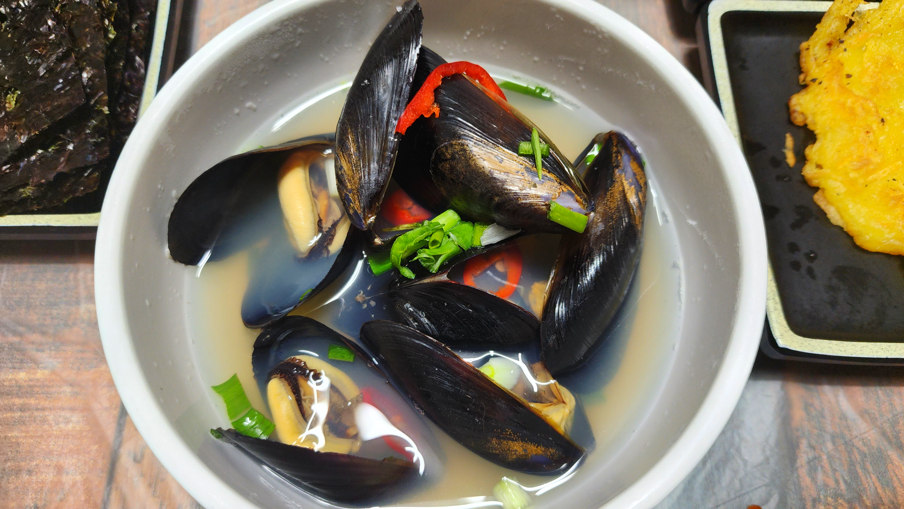 2. 먼저 따뜻한 미역국과 홍합탕을 먹으면서 속을 달래고 있다보면 생선구이, 단호박 전, 피꼬막, 과메기, 잡채, 씻은 김치, 콘치즈가 나와 차례로 맛을 보면 된다.