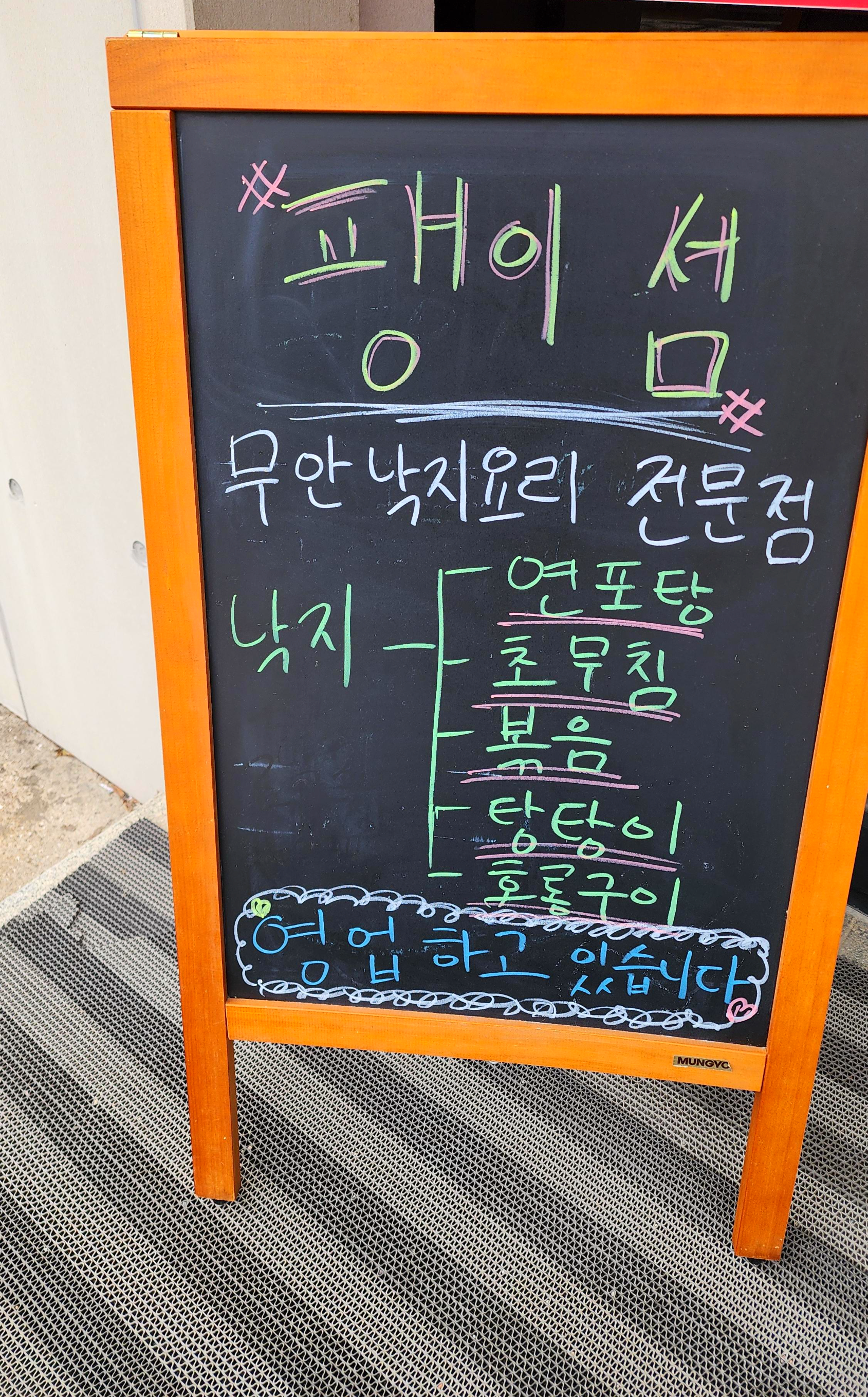 우리나라 갯벌에서 잡아 올린 산 낙지만으로 여러 가지 다양한 요리를 선보이는 곳. 세월이 묻어나는 실내 인테리어가 정겹게 느껴진다. 연포탕, 세발낙지, 탕탕이, 철판볶음, 초무침, 볶음 등 다양한 요리 중에서도 배추, 단호박, 무를 튼실한 낙지와 함께 넣어 끓이는 연포탕이 가장 인기가 좋은 전남 무안 맛집 '팽이섬'에서 점심으로 먹은 메뉴 '연포탕' 소개해 본다.