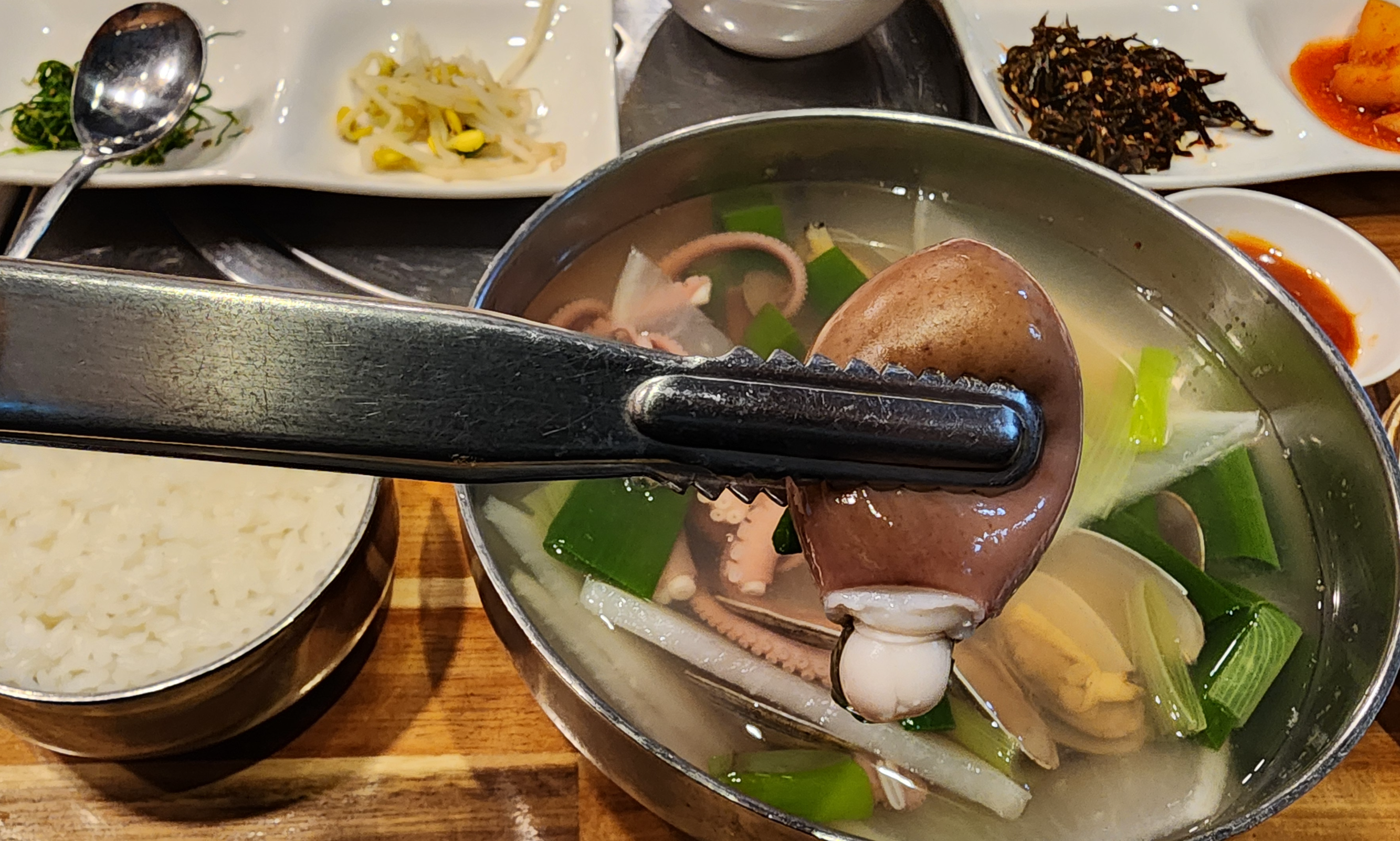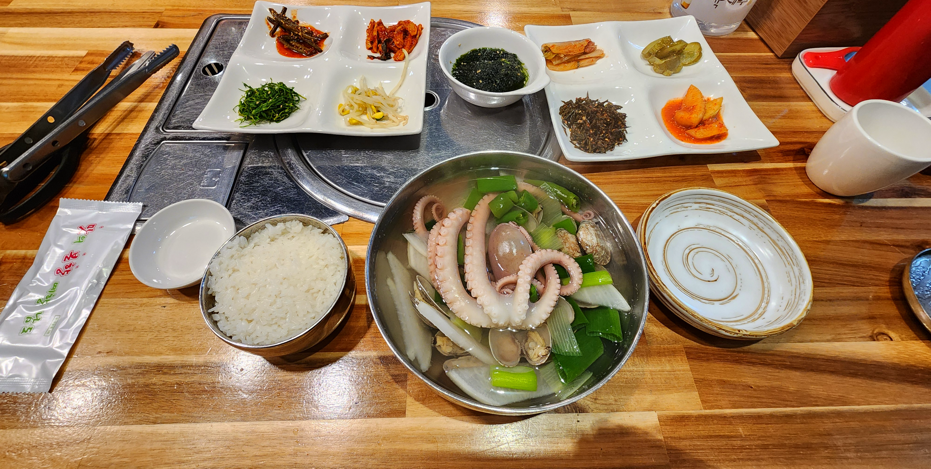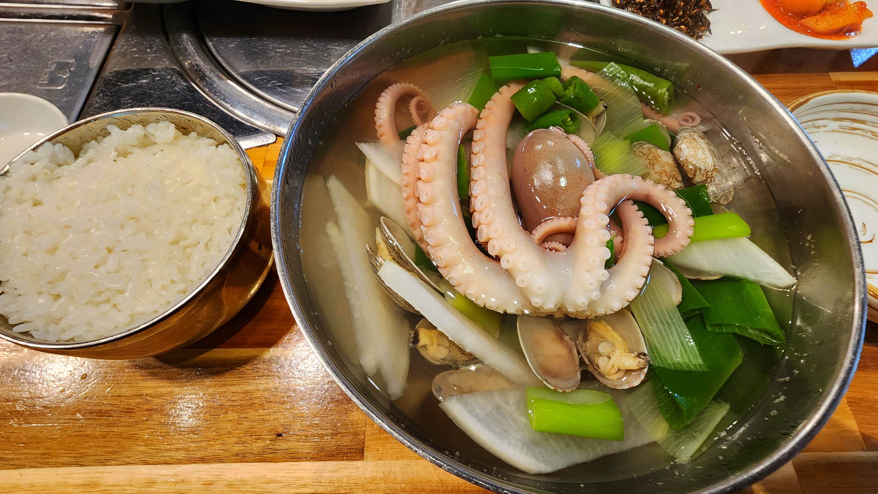 1. 연포탕을 주문하면 곁들이찬 9가지로 상이 차려지고 고슬고슬 윤기 나는 밥에 삼삼하고 깔끔한 국물의 연포탕에 들어있는 쫄깃한 식감과 은은한 감칠맛의 낙지가 입맛을 잡아준다.