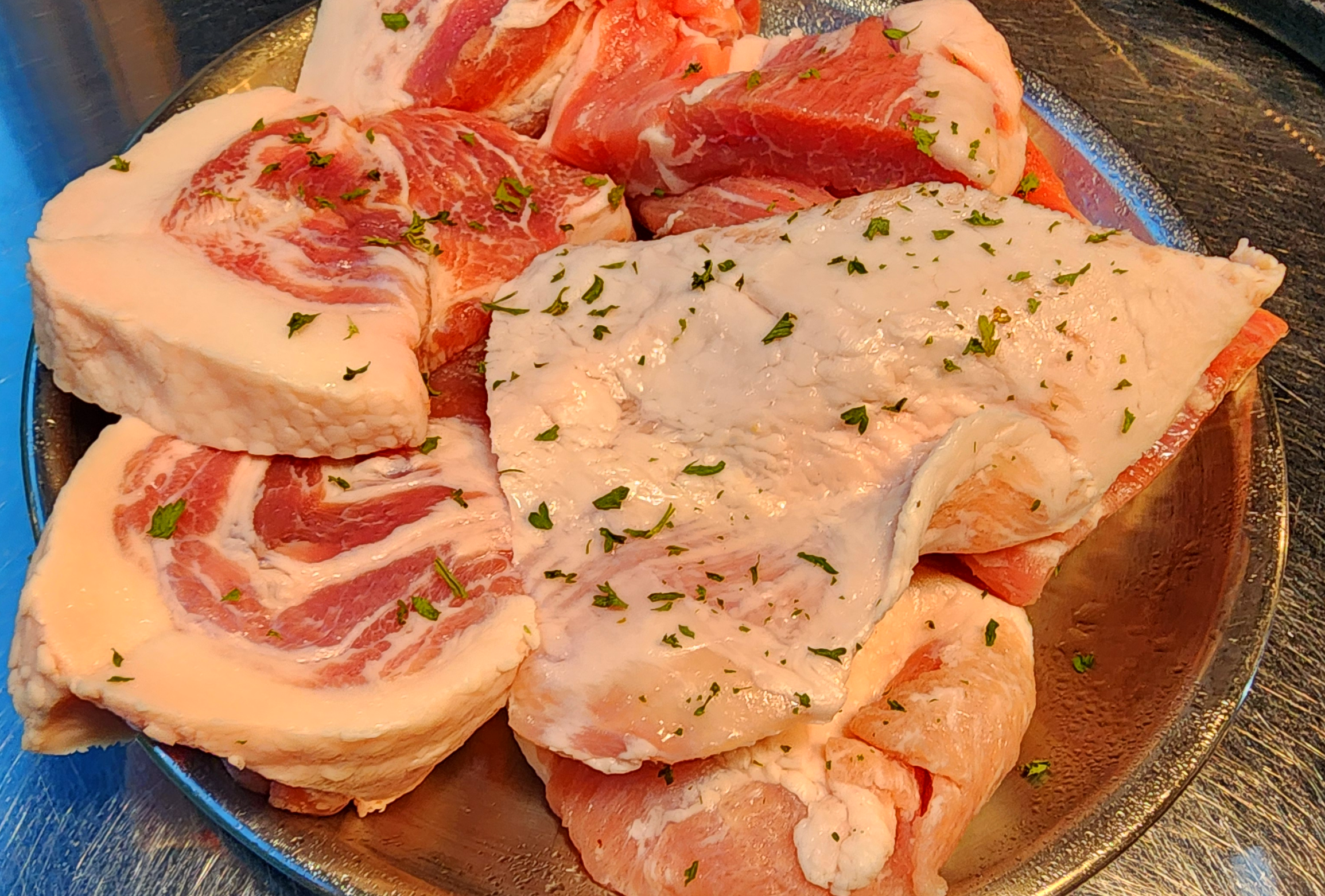 목살은 지방과 살코기가 적당한 비율로 섞여있는 부위다. 목살에는 리놀렌산이라는 성분이 풍부한데, 이는 항체나 호르몬 등을 만들어내 염증을 막아줘 면역력을 높이는 효과가 있다. 목살은 주로 구이나 보쌈, 불고기용으로 쓰인다.