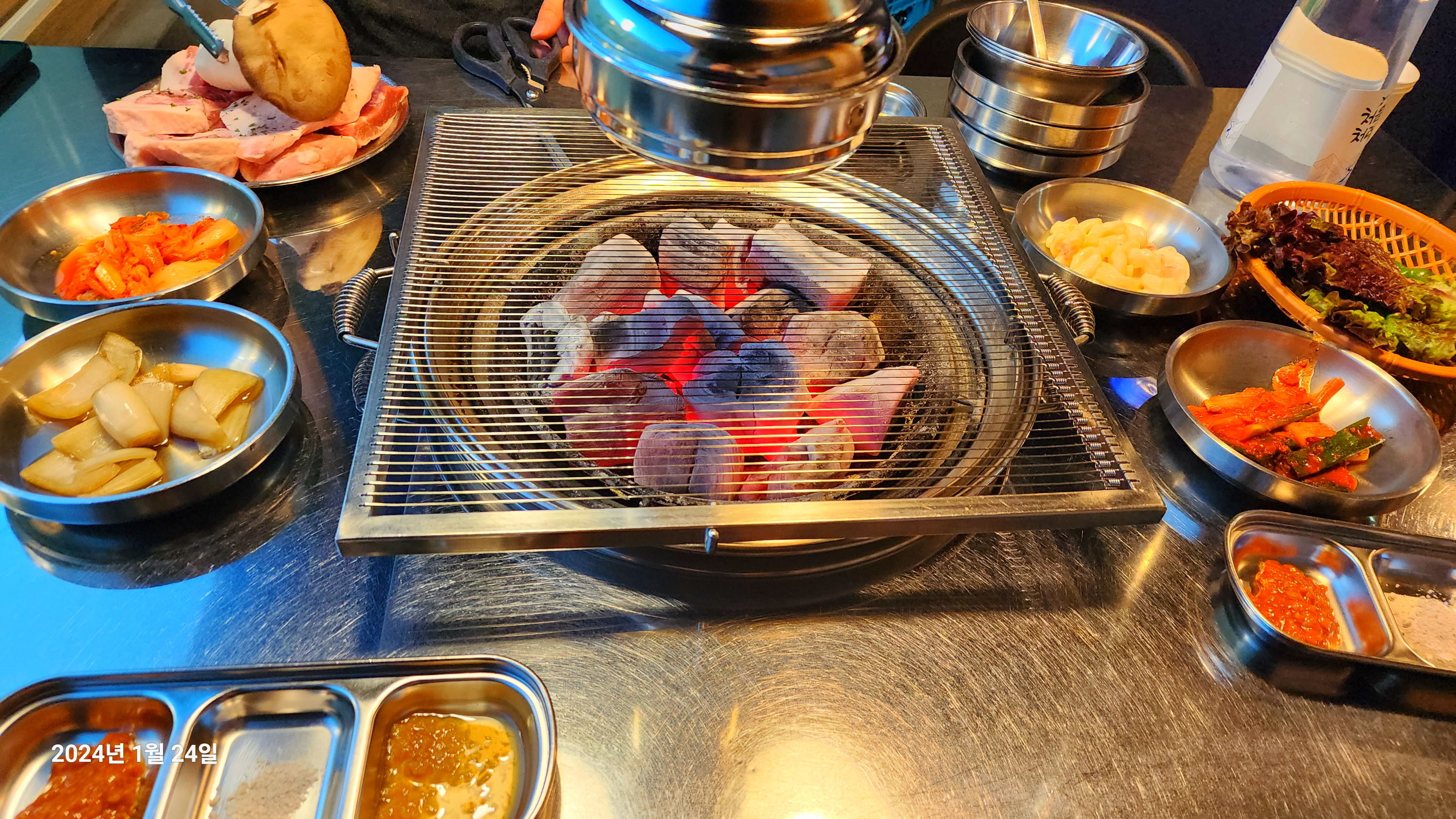 1. 우리 일행은 '돼지생고기 모둠목살'과 '꼬들목살'을 주문했다. 상 중앙에는 달궈진 참숯에 불이 타오르고 불판이 올라가 달궈진다. 돼지고기와 궁합이 잘 맞는 식재료들 양파장아찌, 생마늘, 김치, 상추등의 채소와 각종소스들, 한 불판에서 익히는 '생고기모둠 목살'과 '꼬들목살'등으로 상이 차려졌다.