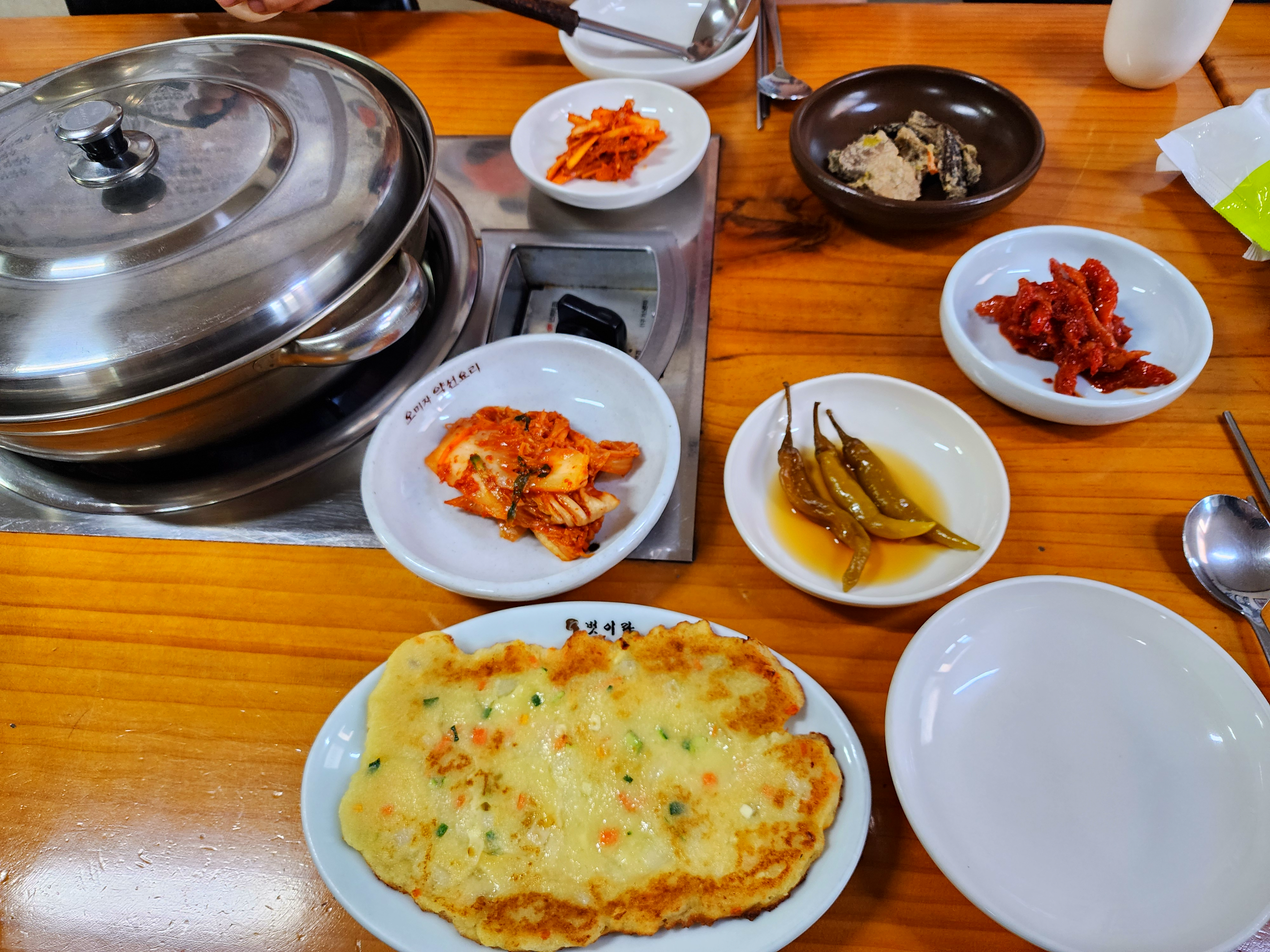 1. 메인 요리인 '버섯손두부전골'이 먼저 나오고 곁들이찬과 밥, 앞접시등이 세팅된다. 기본찬으로 6가지 정도의 나물반찬들이 나오며 인기메뉴로는 손두부 만들 때 나오는 비지를 넣어 부친 '비지 전'으로 두부전골이 끓기 전 입맛을 돋우기에 딱이다.