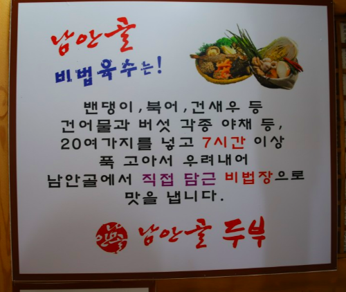 2. 남안골 버섯손두부전골의 비법 육수는? 밴댕이, 북어, 건새우 등 건어물과 버섯, 각종야채등 20여 가지를 넣고 7시간 이상 푹 고아서 우려내어 남안골에서 직접 담근 비법장으로 맛을 낸다고 한다. 문경 점촌 밥집 남안골의 두부는 문경콩을 직접 갈아서 만든 손두부와 그밖에 팽이버섯, 느타리버섯, 목이버섯등이 들어 있으며 큼직한 수제만두 5개와 떡국 떡도 함께 들어 있는 푸짐한 구성이다.