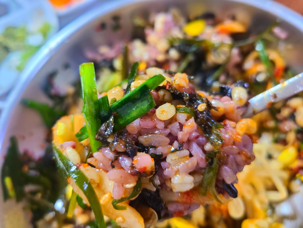 3. 대표메뉴인 보리밥과 함께 계절별로 다른 7가지 종류의 나물이 오른다. 김치종류는 눈으로 보기보단 먹어보면 시원하고 싱싱한 맛이 느껴지고 나물은 대부분 참기름, 들기름으로 무쳐 담백하면서도 고소한 맛이 보리밥과 잘 어울린다. 특히 화학조미료를 쓰지 않아 손맛이 배어 있는 음식은 하나같이 먹고 난 뒷맛이 개운한 느낌을 준다.