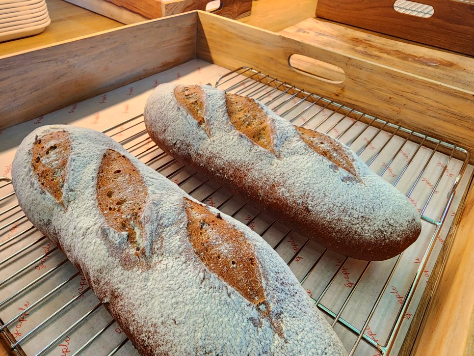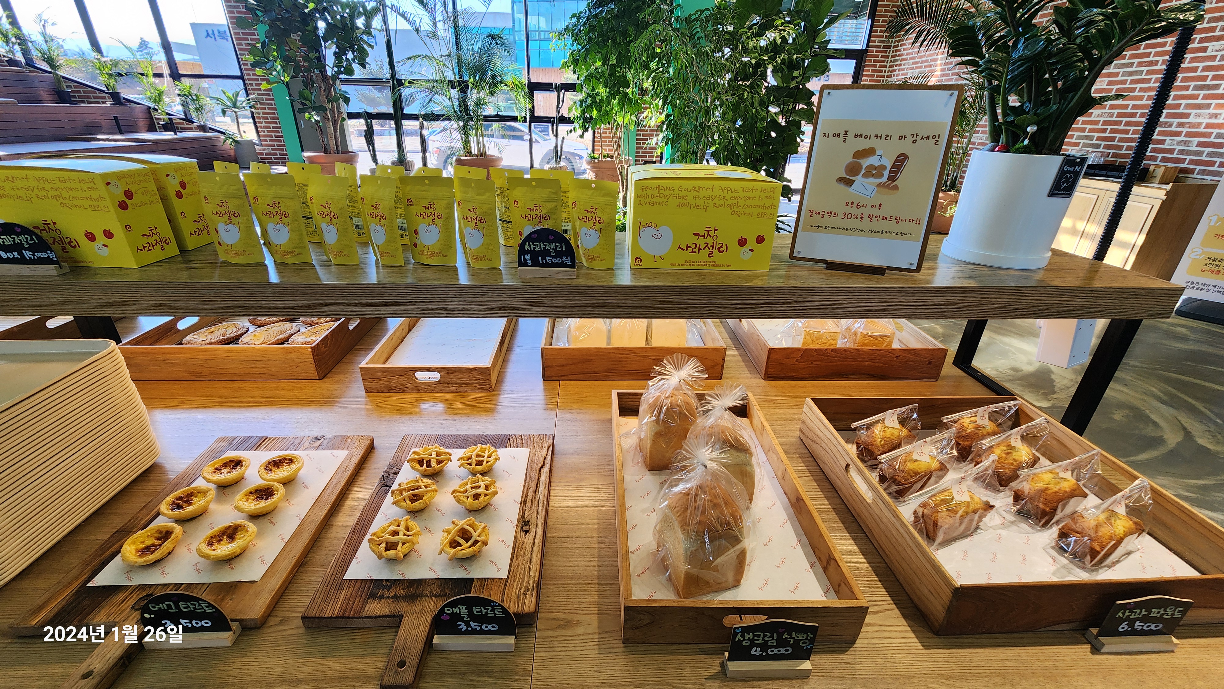 2. 거창 지애플은 베이커리 카페로 사과를 중심으로 모든 빵이 만들어진다. 사진의 왼쪽부터 <올리브치즈식빵, 홍차브레드, 사과파이, 에그타르트, 생크림식빵, 사과파운드> 등 온통 건강빵들이 즐비하게 진열되어 있다.