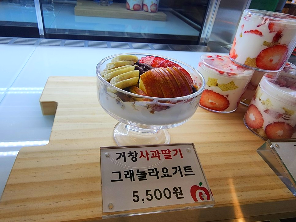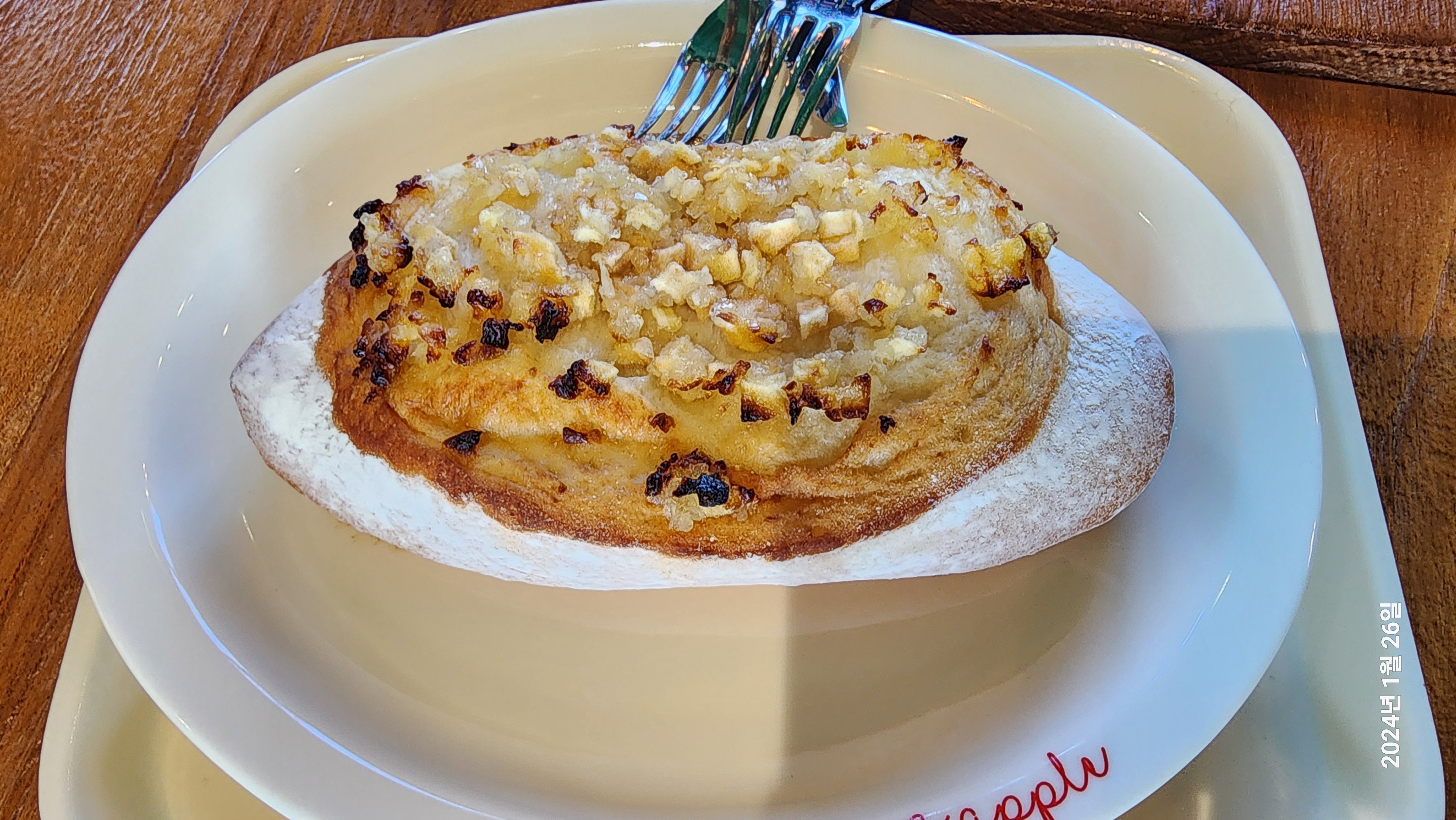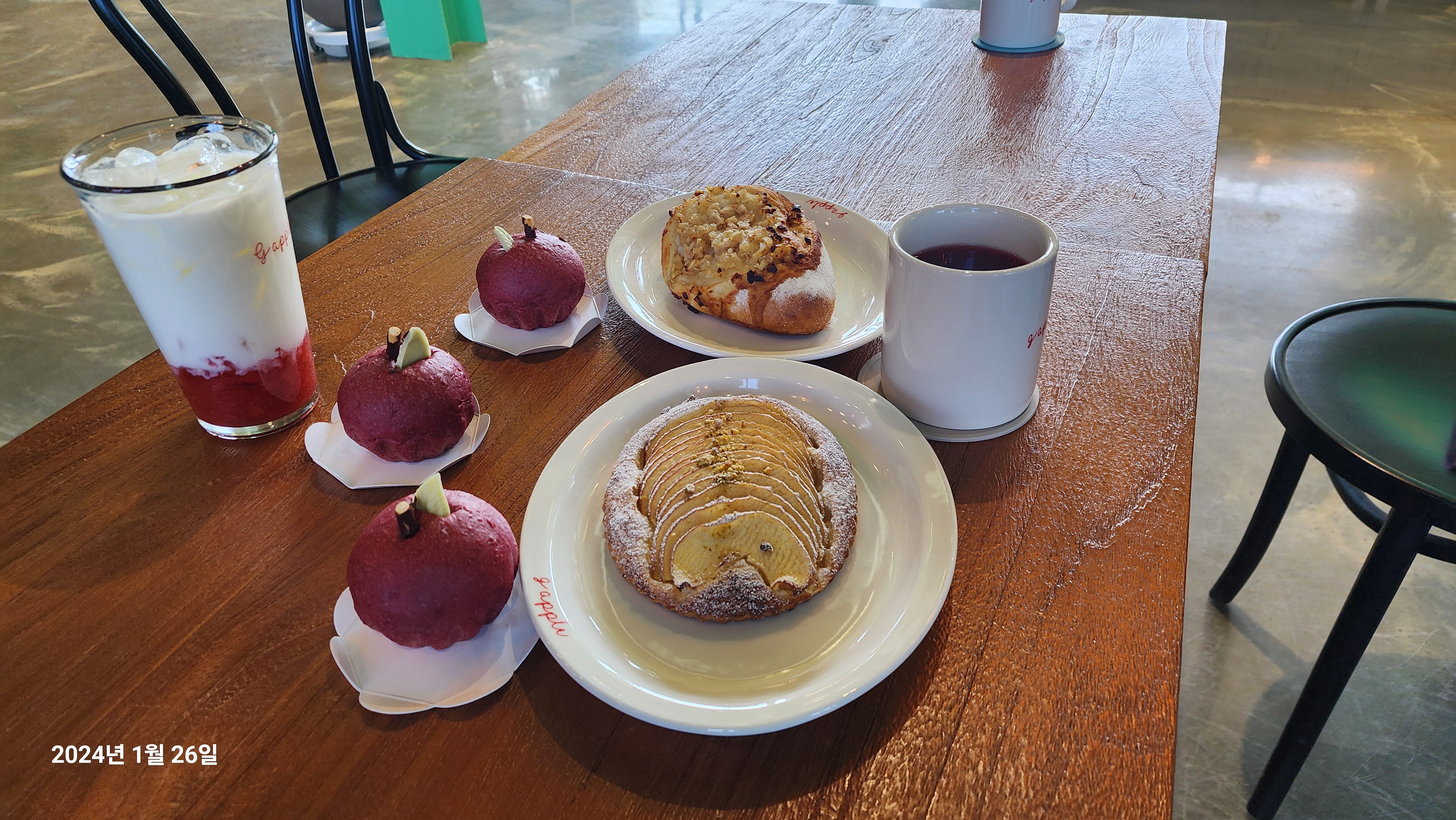 4. 지애플은 사과카페라는 명성에 걸맞게 <사과마늘꿀빵, 지애플사과파이, 지애플사과빵>등 온통 사과로 만든 빵들이 너무나 맛있고 모양도 예쁘다. 딸기라테와 커피도 함께 먹으니 명품사과의 고장 거창의 느낌이 온몸으로 확:: 온다.