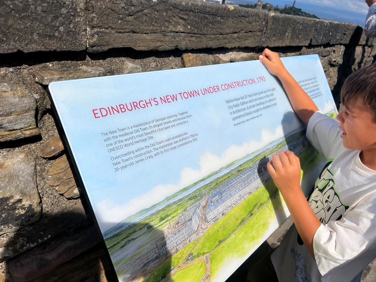 9. 그림과 함께 자세히 설명된 내용은 1793년에 건설된 에든버러의 뉴타운(New Town)에 관한 것이다. 이 표지판은 에든버러의 새로운 지구가 어떻게 조지 왕조 시대의 섬세한 계획과 고대 도시의 아름다움을 결합하여 세계 문화유산으로 자리 잡게 되었는지를 설명한다.