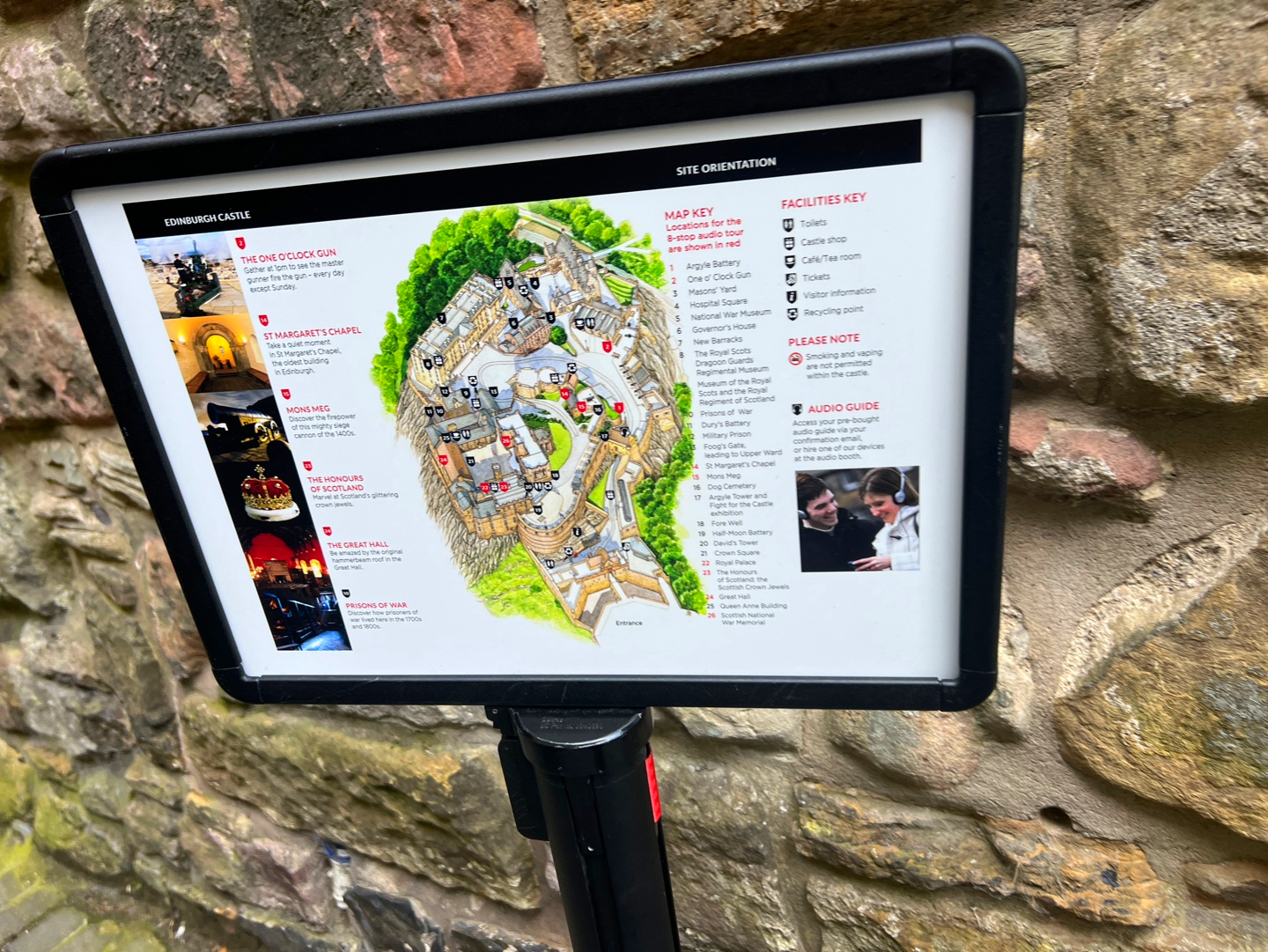 2. 에든버러 성의 디지털 표지판은 이 고성의 깊은 역사를 담고 있는 여러 명소들을 안내한다. 이 가이드는 성내의 주요 관광 명소들을 소개하면서 방문객들이 성의 구석구석을 더 깊이 탐험할 수 있도록 도와준다. 가장 눈에 띄는 명소 중 하나인 'St Margaret's Chapel'은 에든버러 성에서 가장 오래된 건축물로, 그 소박하고 성스러운 분위기가 방문객들에게 깊은 감동을 준다. 'Mons Meg' 대포와 'The Great Hall' 역시 이 성이 지닌 군사적, 역사적 중요성을 상징하는 전시물들이다.