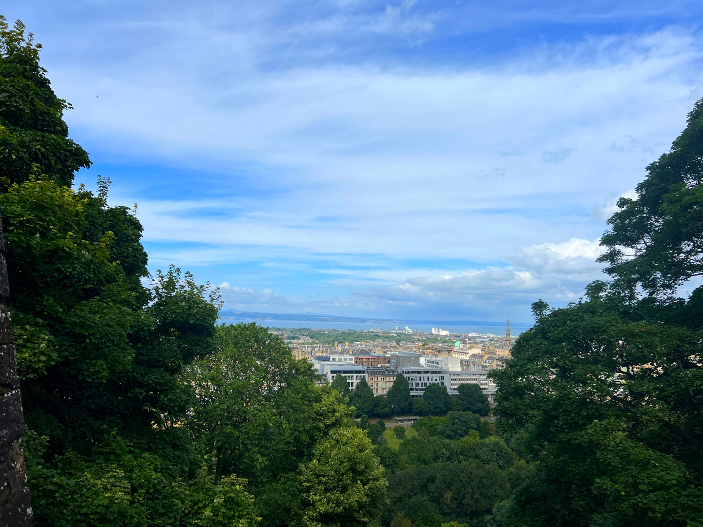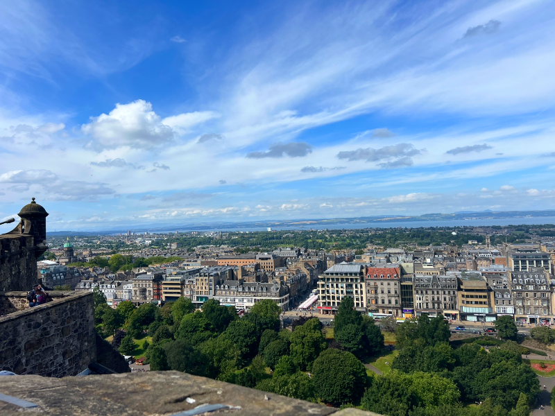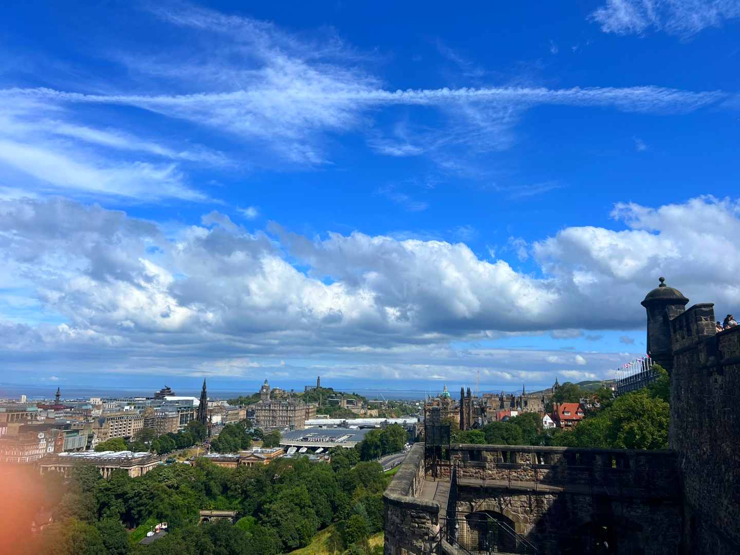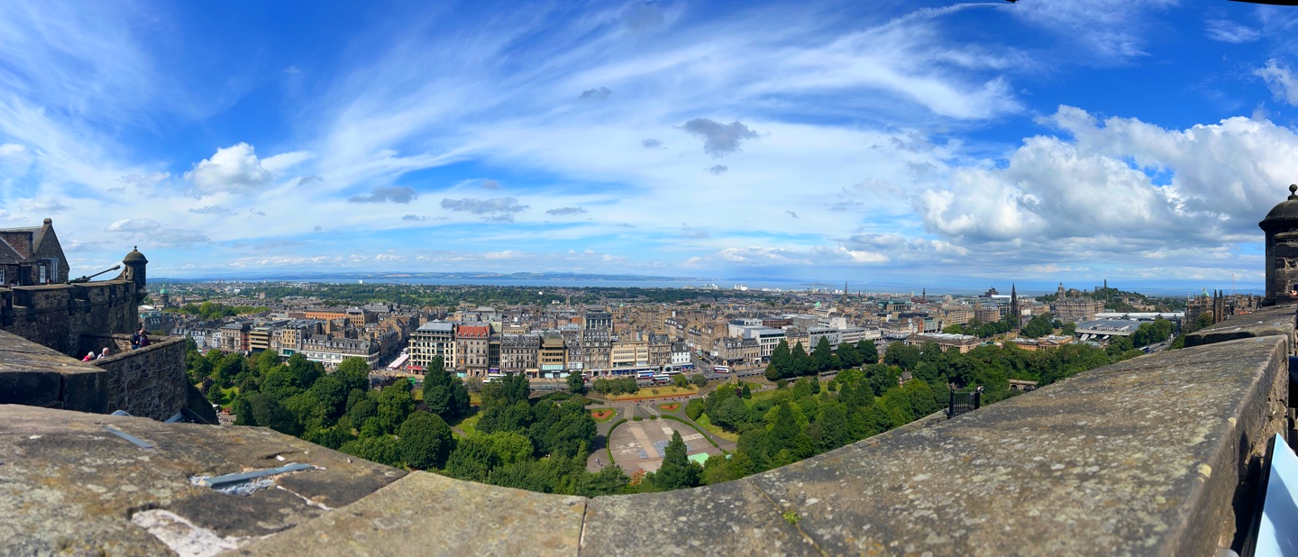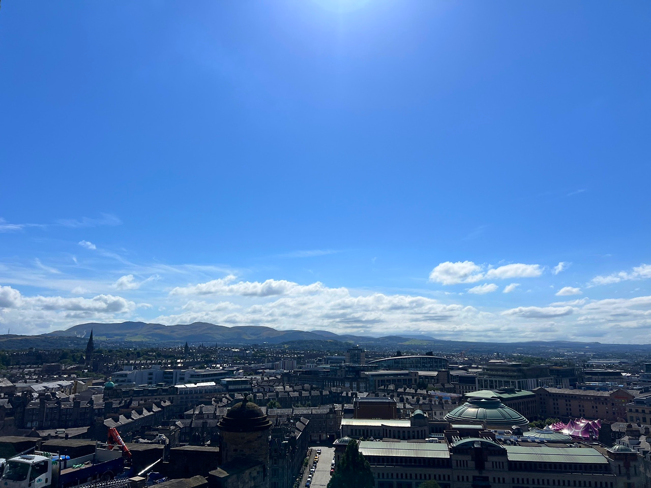 에든버러의 심장부를 이루는 교회 첨탑과 전통 건축물들은 이 도시가 얼마나 풍부한 역사와 문화를 간직하고 있는지를 말해준다. 그 사이로 현대적인 건물들이 조화롭게 어우러져, 에든버러의 다채로운 면모를 드러낸다. 성에서 바라보는 이 풍경은 에든버러의 역사적 중심지에서 새로운 시대로의 전환을 목격하는 듯하다.