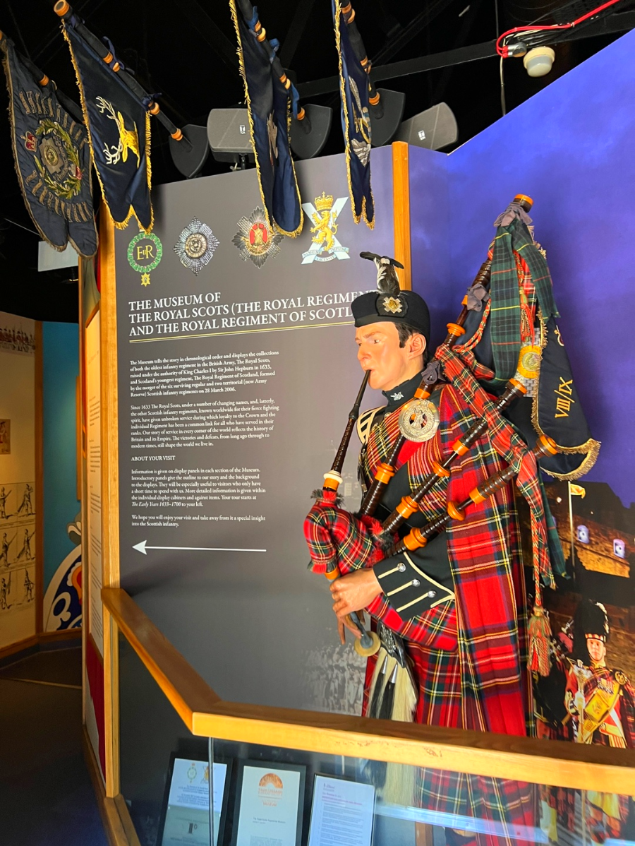 21. 에든버러 성의 깊은 복도를 거닐다 만난 전시품 중에서도 특히 눈길을 끄는 것은 스코틀랜드 하이랜더의 전통 복장을 입은 마네킹이다. 이 화려하고 섬세한 의상은 스코틀랜드의 깊은 역사와 문화를 한눈에 보여주는 살아있는 유산이다. 이 전통 복장은 특히 스코틀랜드의 고원 지방에서 오랜 세월 동안 착용되어 온 것으로, 강렬한 색상의 타탄체크무늬가 특징이다. 이 복장의 중심에는 '킬트'가 있으며, 이는 스코틀랜드 남성의 자부심과 가문의 상징을 나타내는 중요한 의상이다. 킬트 외에도 머리에 쓰는 페더 본넷과 어깨에 걸치는 플레이드까지, 각 부분이 모여 하이랜더의 용맹과 낭만적인 이미지를 완성한다.