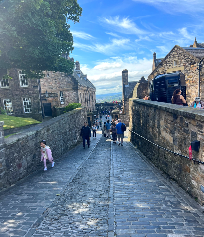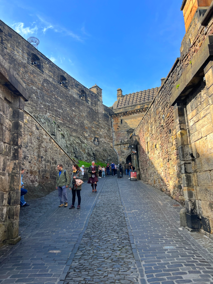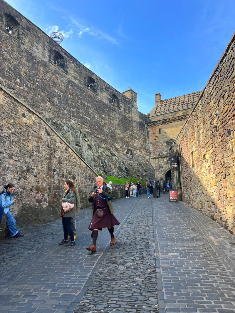 6. 성벽 사이를 거니는 사람들 중 한 남성이 입고 있는 전통 의상은 '킬트'라고 불린다. 킬트는 스코틀랜드 남성들이 전통적으로 착용하는 스커트형 의상으로, 클랜(씨족)을 나타내는 특유의 타탄체크무늬가 특징이다. 킬트는 스코틀랜드의 상징적인 의상으로, 많은 문화 행사나 공식적인 자리에서 자주 볼 수 있다.