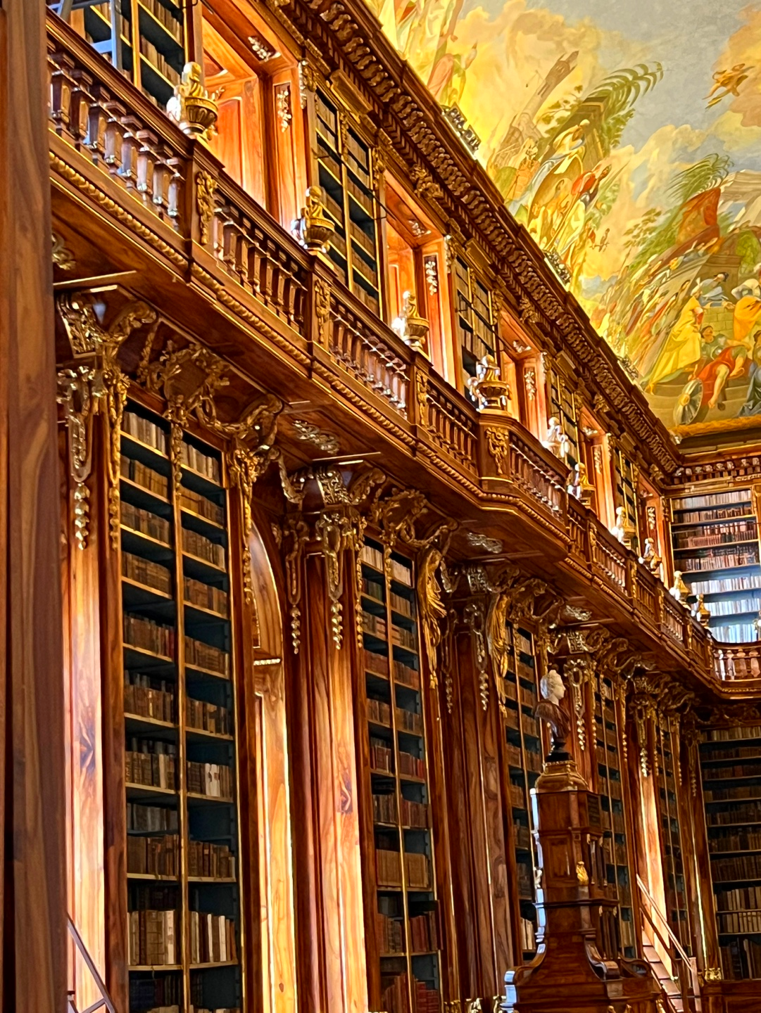 4. 프라하의 숨결을 따라 걸으며, 스트라호프 수도원의 문을 열었다. 세월의 무게만큼 풍부한 이야기를 간직한 신학 홀은, 그 자체로 하나의 거대한 책이자 시간의 증언이다. 고딕 아치와 바로크의 화려함이 어우러진 이곳은, 마치 중세의 성직자들이 곧 나타나 성가를 부를 것만 같은 신성한 공간이다.