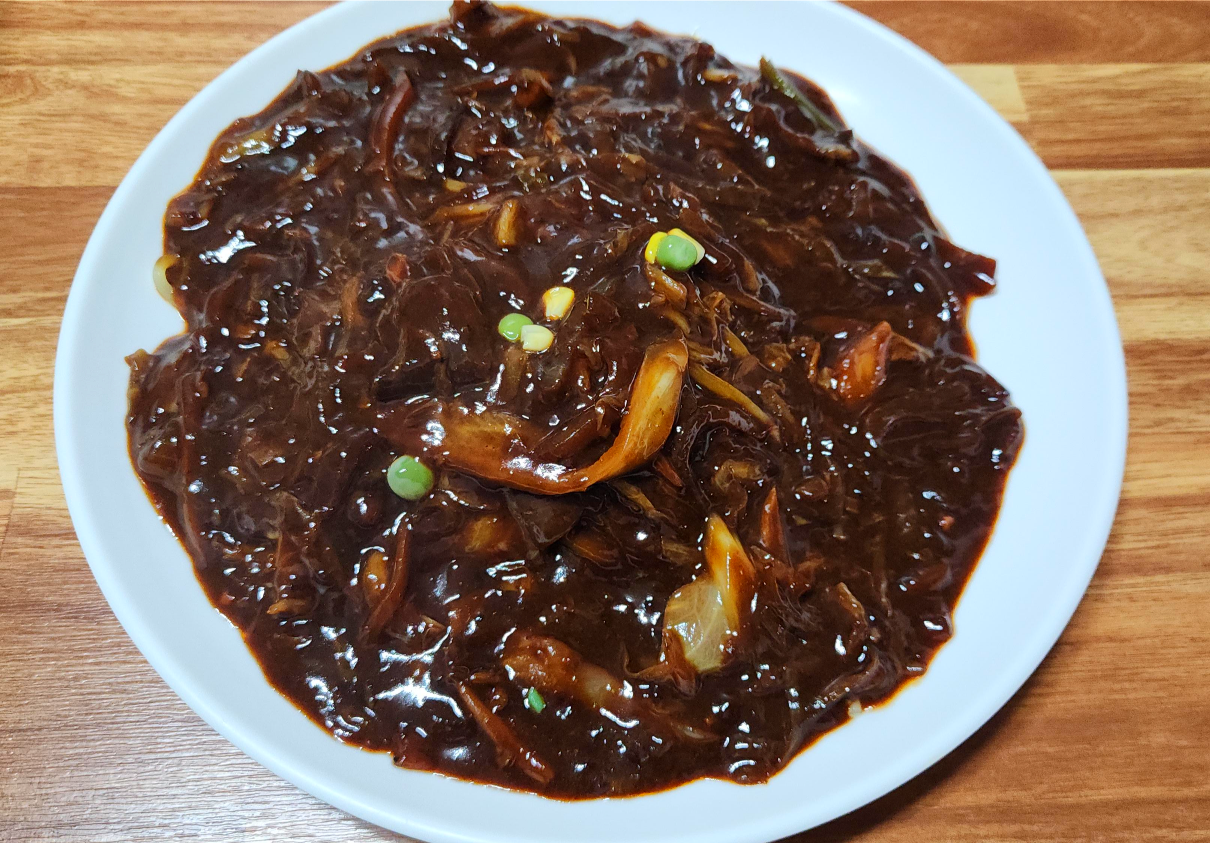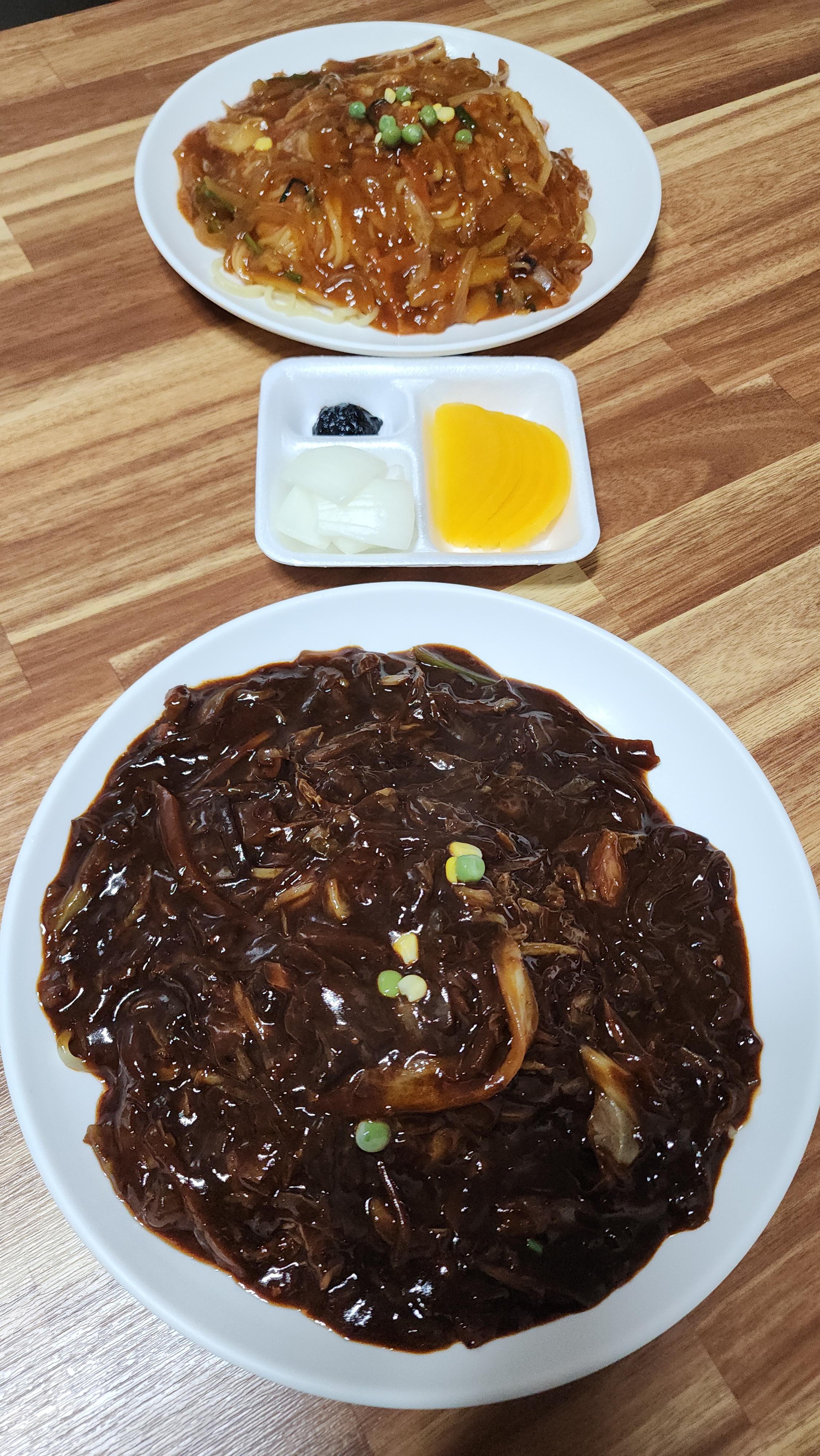 1. 상차림은 한국 중식당에서 기대하는 전형적인 반찬, 바삭한 노란 단무지, 신선한 양파, 깊은 맛의 춘장과 함께 제공되었다.