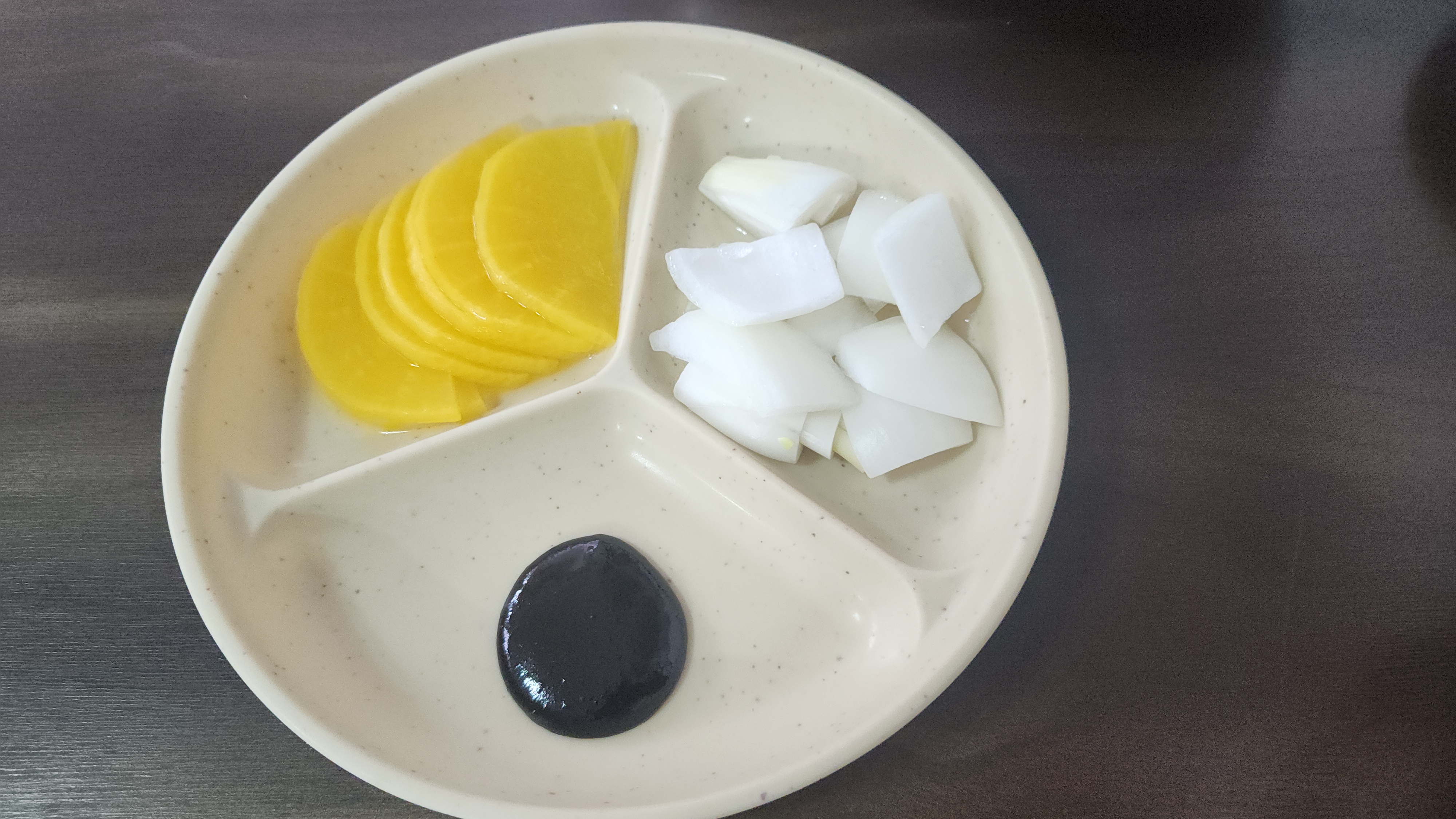 1. 짬뽕을 주문하고 자리에 앉으니 기본 상차림은 한국 중식당에서 기대하는 전형적인 반찬, 바삭한 노란 단무지, 신선한 양파, 깊은 맛의 춘장과 함께 김치까지 제공되었다.
