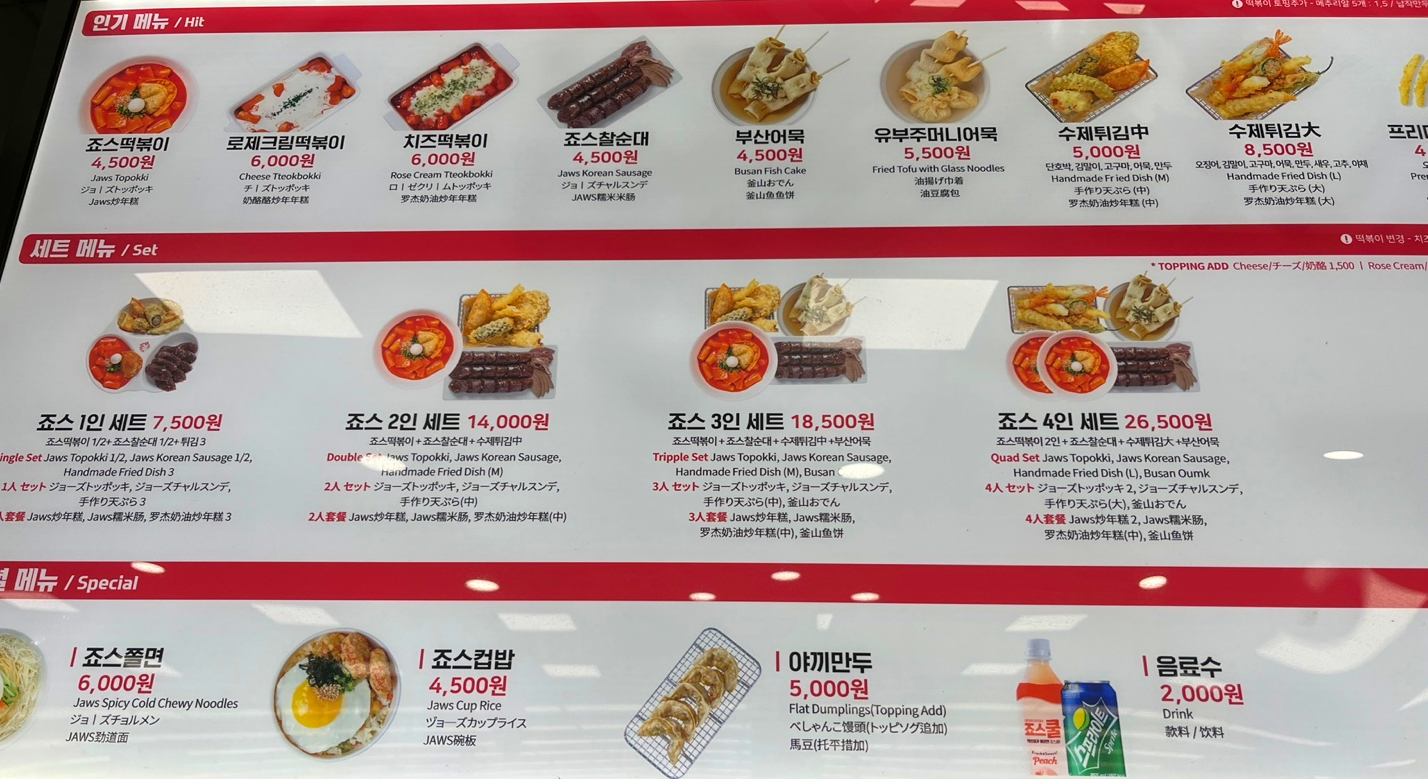 아들과 딸을 모두 출가시키고 손자, 손녀 재롱보면서 평화로운 인생 후반전을 보내고 있는 판교에 사는 2살 터울의 작은언니를 서울역에서 오랜만에 만났다. 거창한 맛집 대신, 우리 자매의 학창 시절 추억이 담긴 분식 4 총사를 맛보기로 했다. 서울역에 위치한 죠스떡볶이 롯데마트 서울역점에 자리를 잡고, 죠스 3인 세트—죠스떡볶이, 죠스찰순대, 부산어묵, 수제튀김—를 주문했다.