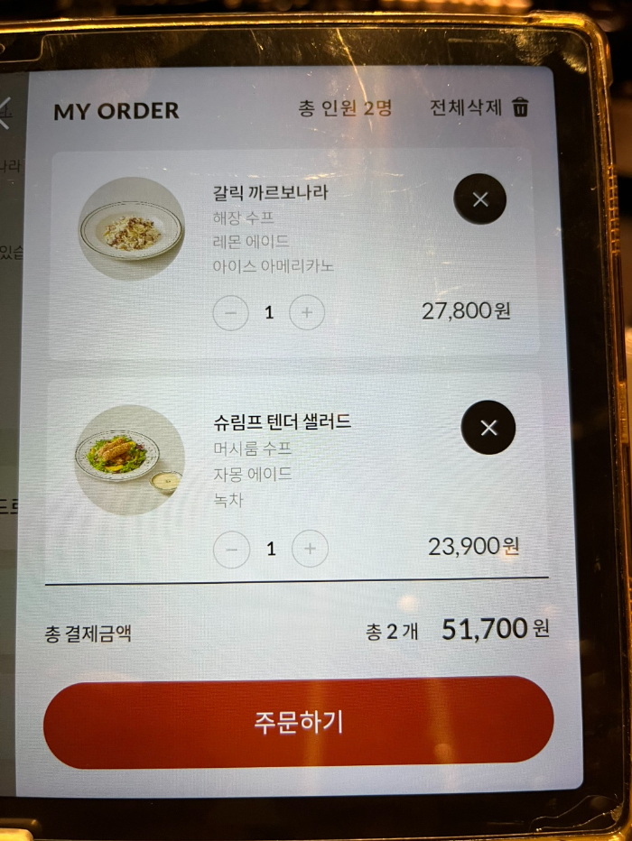 그렇게 모든 코스가 끝나고, 식당 한쪽 벽면에 늘어선 와인저장고를 살짝 둘러보니, 마치 여행의 막바지를 장식하는 풍경처럼 마음 한 켠이 아련하게 물들었다. 부드러운 갈릭까르보나라부터 바삭한 텐더샐러드, 상큼한 에이드와 깔끔하게 마무리해 준 아메리카노와 녹차까지—함께한 모든 순간이 작은 추억이 되어 테이블 위를 반짝였지요.