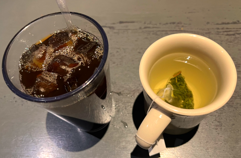 진한 커피 향으로 정신을 맑게 깨워 주는 아이스아메리카노와 따뜻한 온기에 부드럽게 스며드는 녹차—두 잔이 나란히 자리 잡은 모습을 바라보면 마치 서로 다른 계절이 한 공간에 공존하는 듯한 낭만이 번져 간다. 아이스아메리카노는 맑은 잔 속에 시원하게 띄운 얼음이 투명하게 빛나 마시는 순간 목 넘김이 한결 상쾌해졌다. 메인 메뉴의 무거움 혹은 느끼함을 단숨에 씻어내듯 씁쓸하면서도 깔끔한 커피 향이 입안을 개운하게 정돈해 준다.