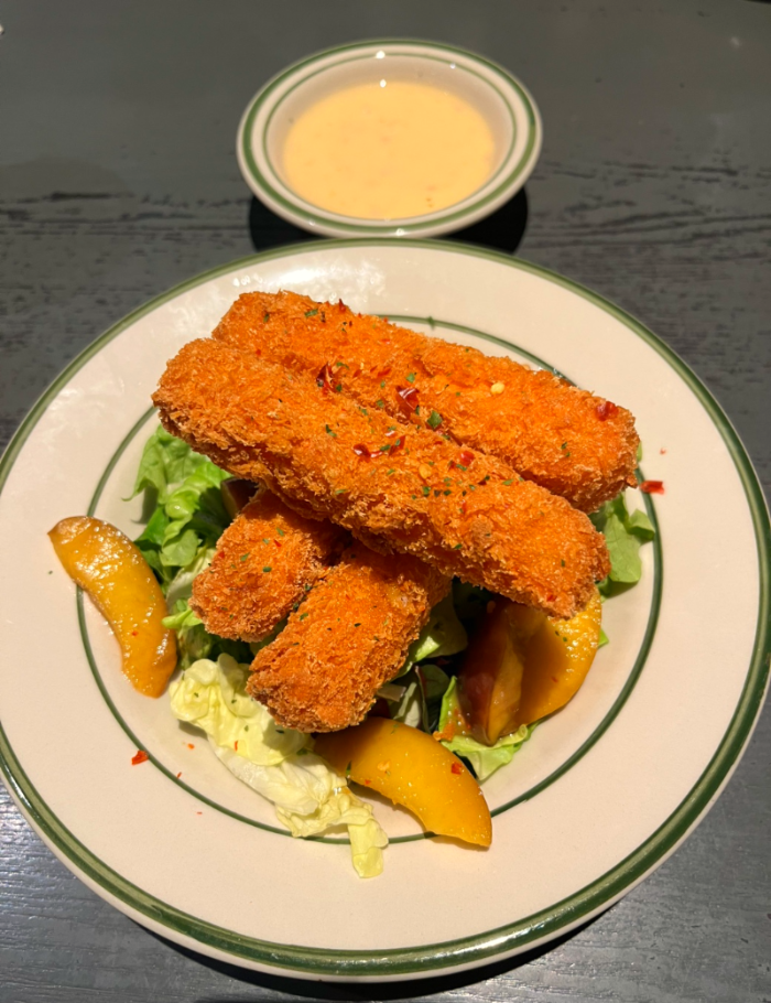 겉은 바삭하게 튀겨져 골드빛으로 반짝이고, 속은 촉촉한 살코기가 부드럽게 녹아드는 텐더가 푸른 샐러드 위에 가지런히 올려져 있으니, 마치 작은 정원 속에서 황금빛 열매를 발견한 듯한 설렘이 느껴진다. 한입 베어 물면, 바삭하는 소리와 동시에 안쪽에서 전해지는 풍부한 육즙이 기분 좋은 충격을 안겨준다.
