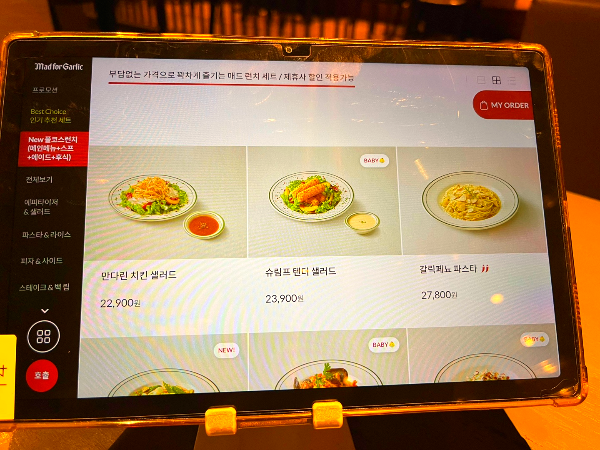 그래서 다음 행선지로 아이파크몰 5층 식당가를 둘러보던 중 반짝이는 눈으로 친구가 발견한 것은 바로 매드포갈릭의 풀코스매드런치코스! 서로 바라보며 “바로 여기가 오늘의 선택이구나” 하고 자리 잡는 순간, 왠지 가슴 한 켠이 설레는 듯했다. 20여 년 만에 한국을 찾은 친구가 무엇이든 새롭게 체험해보고 싶다 하기에 선택 역시 전적으로 그에게 맡겨 보기로 했지요. 그렇게 이탈리안레스토랑 매드포갈릭에서 친구는 크리미한 까르보나라, 저는 바삭한 텐더샐러드를 나눠 먹으며 서로의 오랜 이야기부터 이번 여행의 아쉬움까지 한가득 곁들여 즐긴 시간이 참 낭만적으로 흘러갔습니다. 이제부터 이 맛있고 따뜻했던 순간들을 함께 나누어 볼까요?