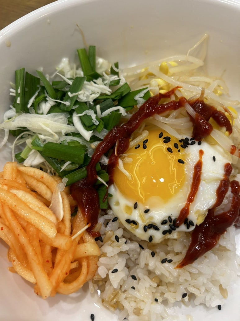 따끈한 밥 위에 반숙 계란프라이와 고소한 참기름, 검은깨가 솔솔 뿌려져 있어 담백한 기본 밥맛부터 훌륭합니다. 여기에 아삭한 콩나물, 감칠맛 나는 무생채, 그리고 신선한 부추+양배추 무침이 함께 제공되어 입맛에 따라 자유롭게 비벼먹을 수 있어요.