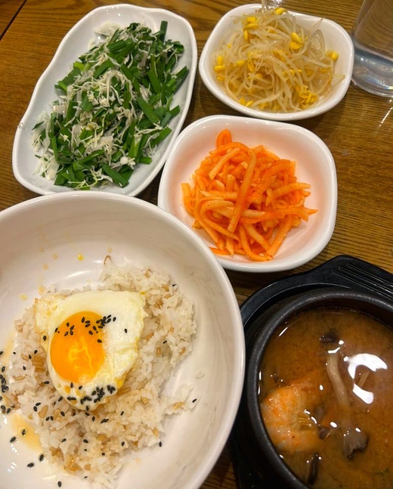 함께 제공되는 반찬 구성도 정갈합니다. 아삭한 식감이 살아있는 콩나물, 새콤달콤한 감칠맛의 무생채, 그리고 신선한 부추와 양배추 무침이 더해져 비빔밥을 내 입맛에 맞게 자유롭게 만들어 먹을 수 있어요.