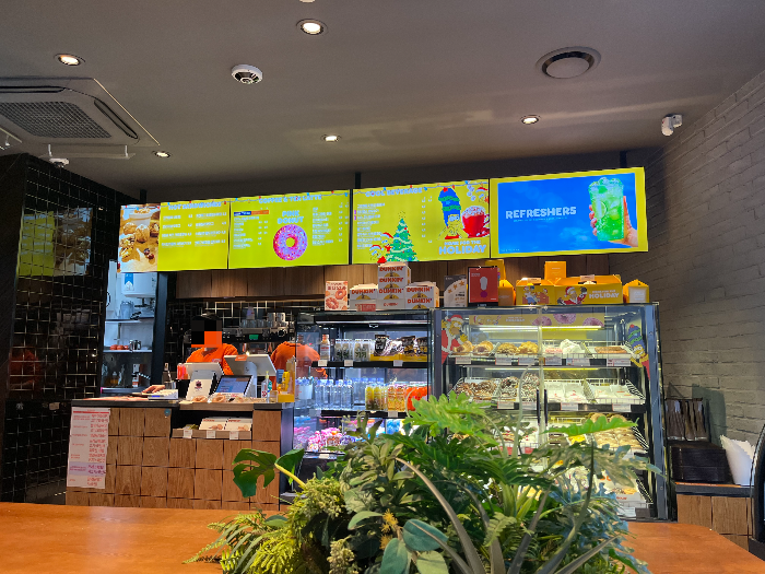 규모는 크지 않지만 매장 안은 생각보다 아늑하고 정돈되어 있었다. 천장에 은은하게 퍼진 조명과 밝은 컬러의 메뉴 보드, 그리고 유리 진열장 안에 가지런히 놓인 도넛들은 이른 아침의 졸음을 단번에 깨울 만큼 선명한 인상을 남긴다. 중앙 테이블 위에 놓인 초록빛 식물들은 공간에 여유를 더해주며, 병원 인근 카페 특유의 긴장감을 부드럽게 중화시킨다.