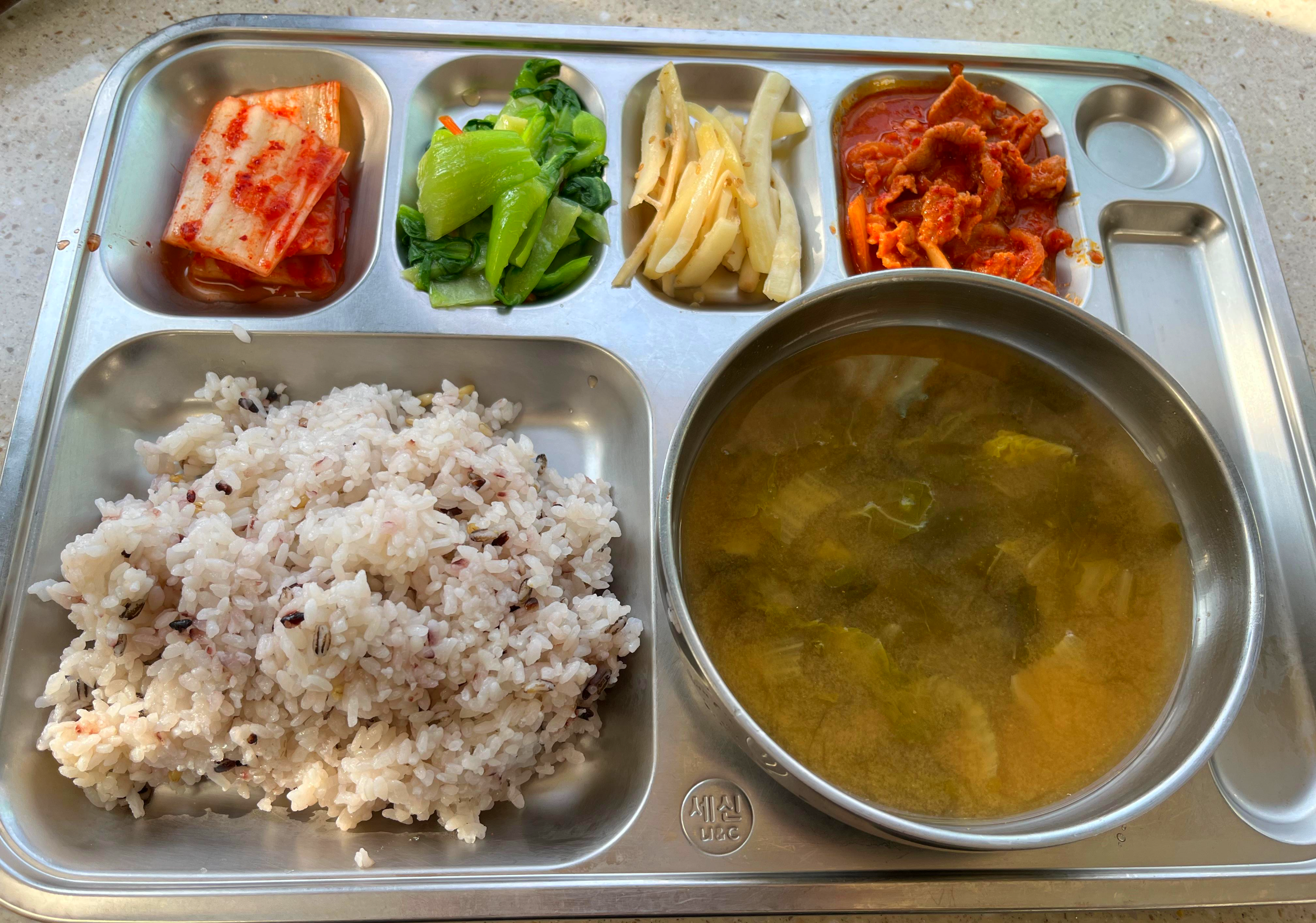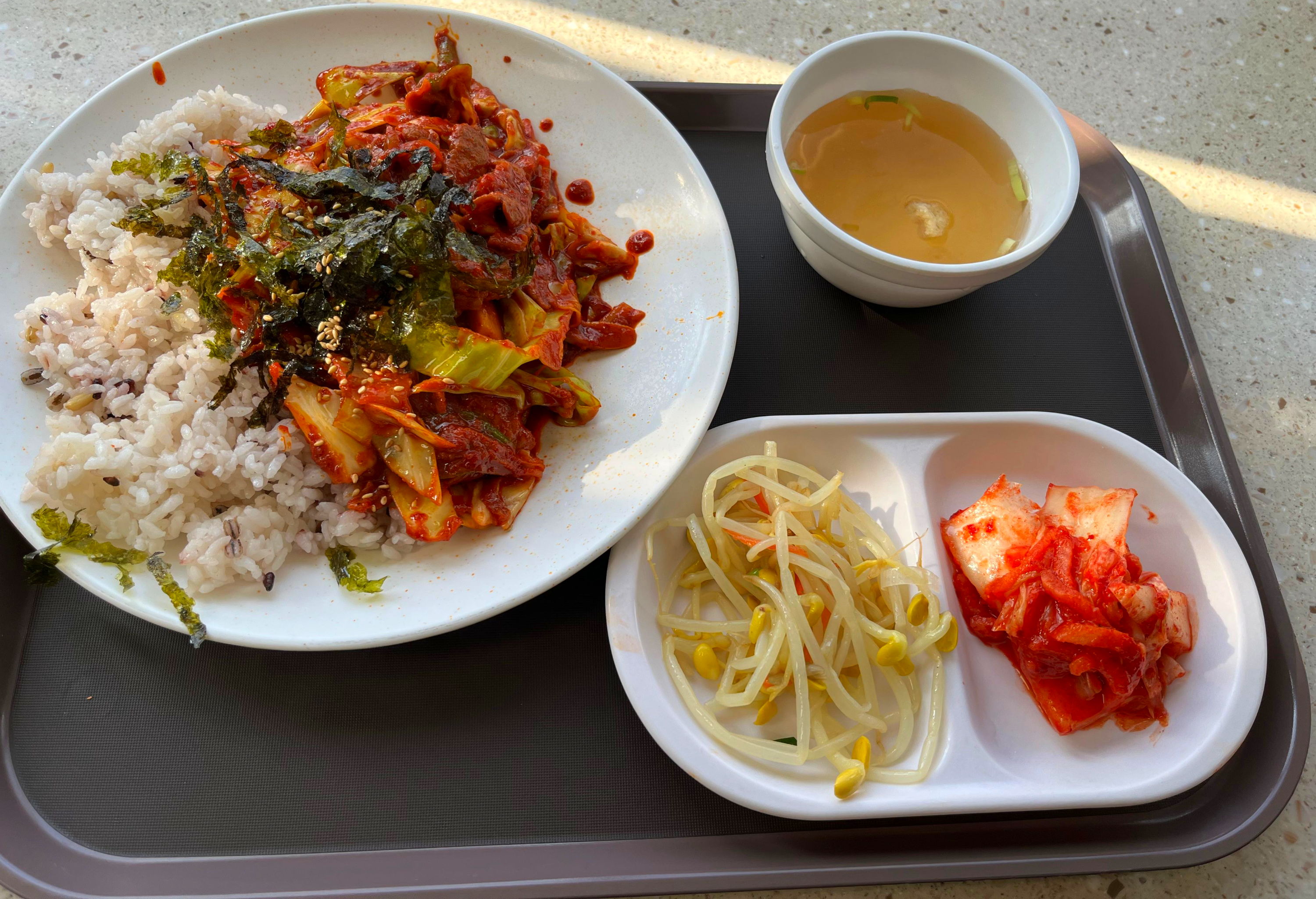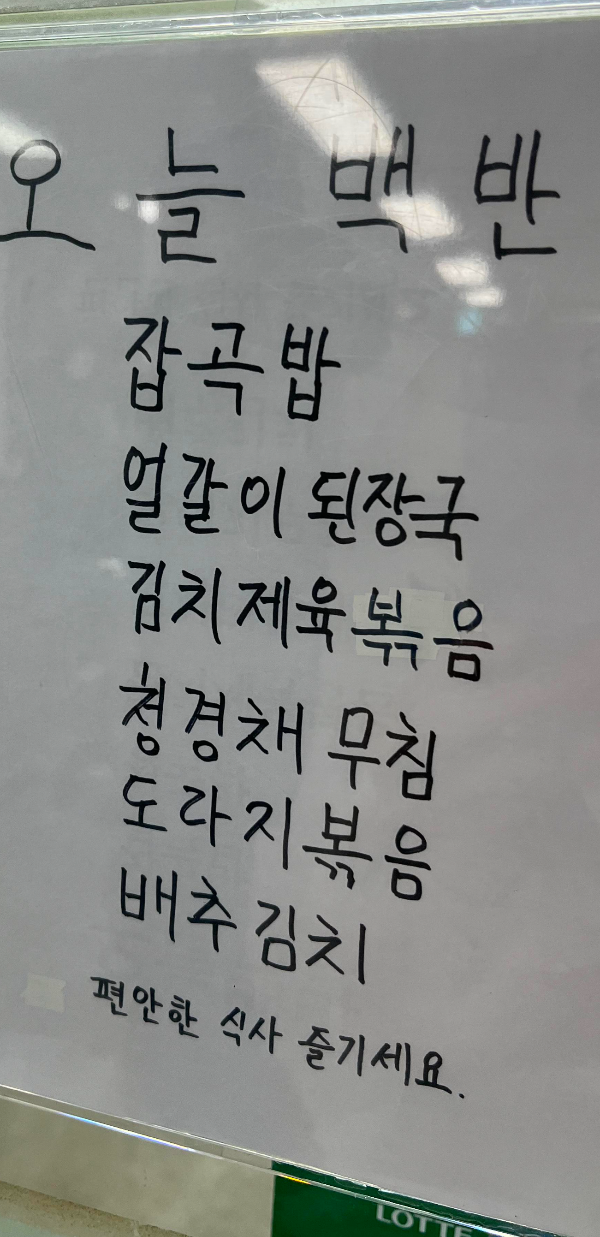 그리고 오늘 밥상에서 특히 좋았던 건 ‘초록’과 ‘하양’의 존재다. 아삭하고 시원한 청경채 무침은 매운맛 사이사이를 환기시키고, 담백하게 볶아낸 도라지볶음은 씹을수록 은근한 향으로 입안을 정돈한다. 마지막으로 빠질 수 없는 배추김치까지—짠맛, 매운맛, 담백함, 아삭함이 한 식판 안에서 자연스럽게 이어지니, 한 숟갈 한 숟갈이 리듬처럼 흘러간다.