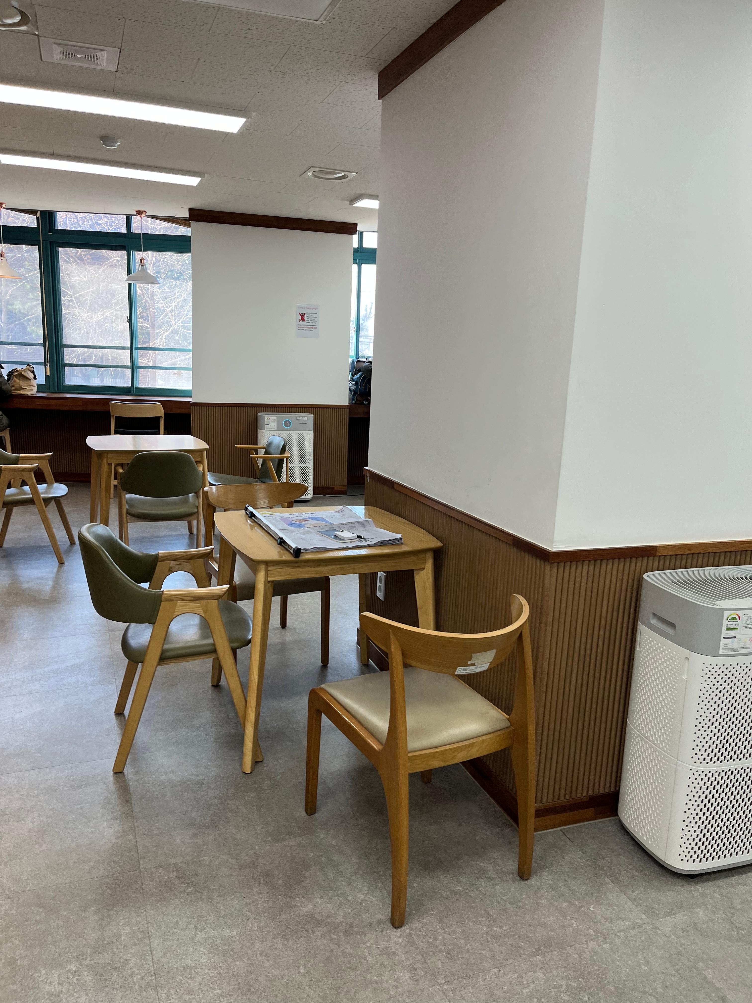 5. 식사를 마치고 용산도서관 1층 식당 밖으로 나오니, 그곳엔 ‘기다림’을 위해 준비된 작은 풍경이 조용히 펼쳐져 있었다. 창가 쪽으로는 낮은 탁자와 의자들이 듬성듬성 놓여 있고, 옆으로 길게 이어진 나무 서고에는 책들이 가지런히 꽂혀 있었다.