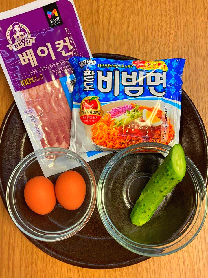 ★재료: 팔도비빔면1봉, 베이컨 1팩,