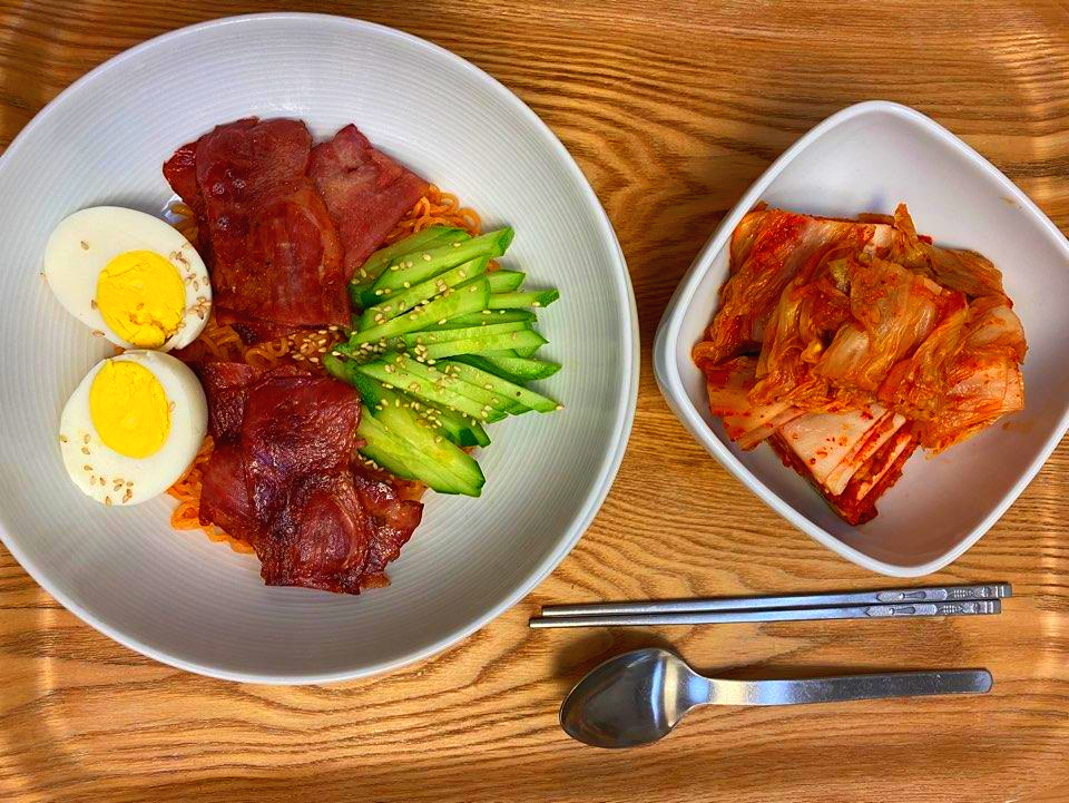 비빔면에 베이컨을