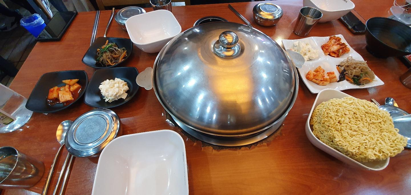 탁자위 중앙에 부대찌개가 담긴
