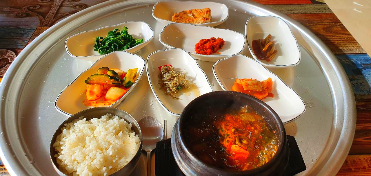 온갖 반찬들과 밥+찌개까지
